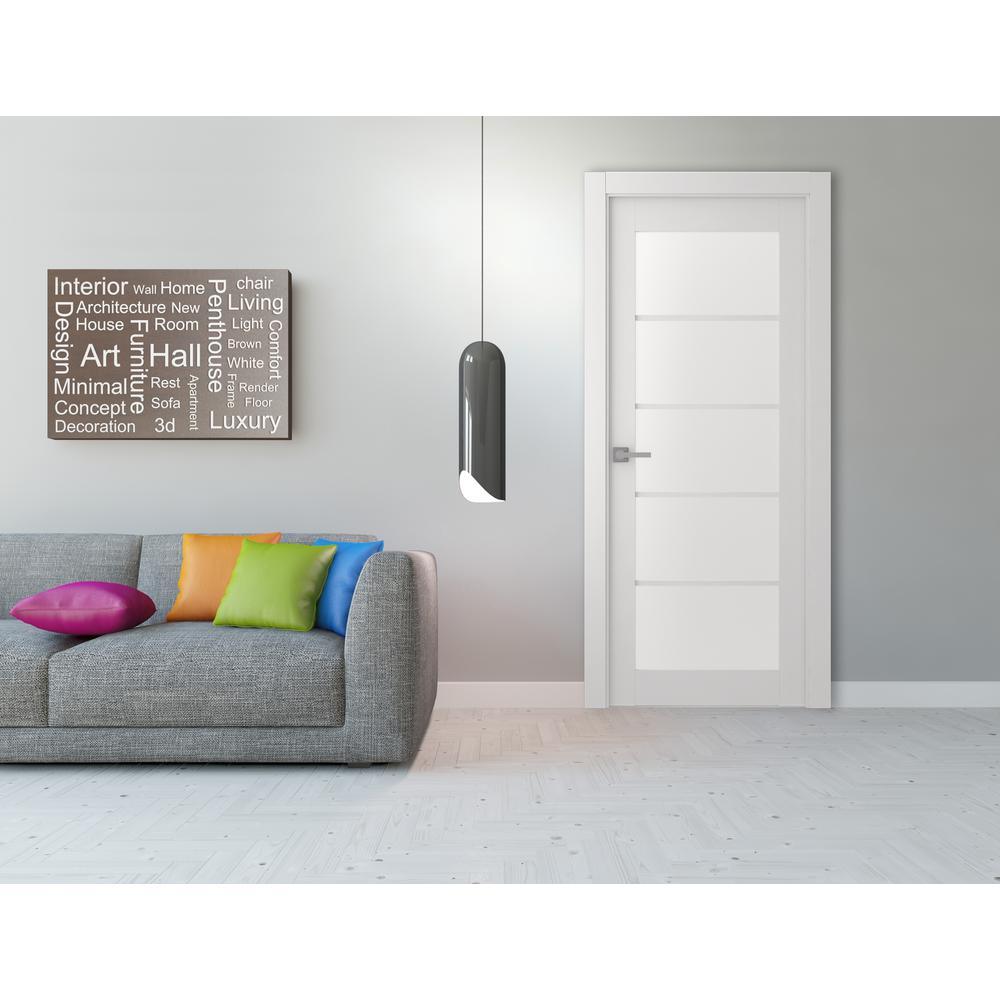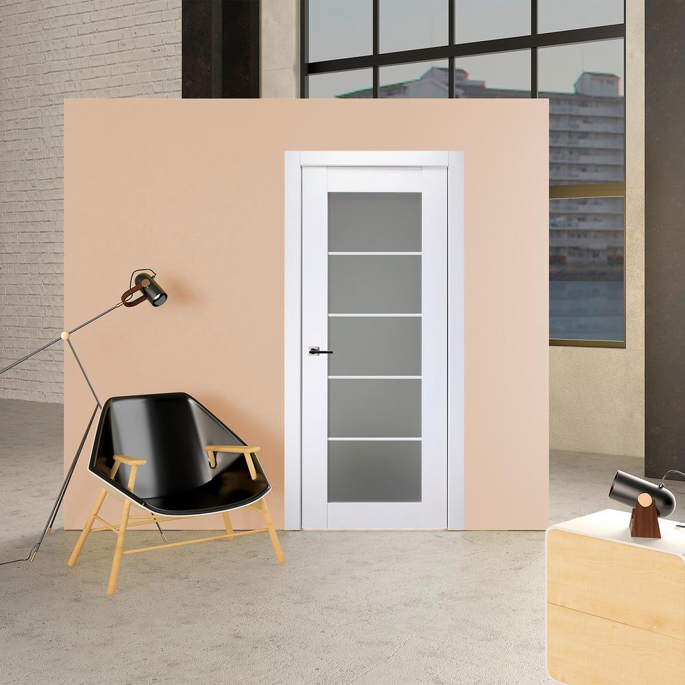 Smart Pro 5-Lite Polar White is a glazed door coated with a premium Italian enamel. The pane of white frosted glass divided into 5-Lite will provide privacy and increase the sense of space even when the doors are closed. Thanks to its aesthetics, Smart Pro 207 Polar White proves to be a smart investment. With the addition of this type of door, you can increase the potential value of your home. Smart Pro is a door of a new generation, in which every detail matters. The combination of sleek design, outstanding quality and robust construction puts the door on the best-selling positions. The light polar white color and the frosted glass panes will do the best to visually expand any home or office space. Smart Pro 5-Lite-10-Lite Polar White consists of a 5-1/2 in. wide solid pine frame and a 1/4 in. thick frosted glass. The frame is coated with premium quality Italian enamel. The glass is tempered so in case of damage it shatters into small, smooth surfaced pellets, excluding the possibility of injury. Wooden tenons and the best industry adhesives are used to assemble the parts of the door frame. The assembled slab is kept under pressure until it gains the necessary stiffness and solidity of the construction. Additional moldings are applied to the glass surface in order to create a 5-Lite design.