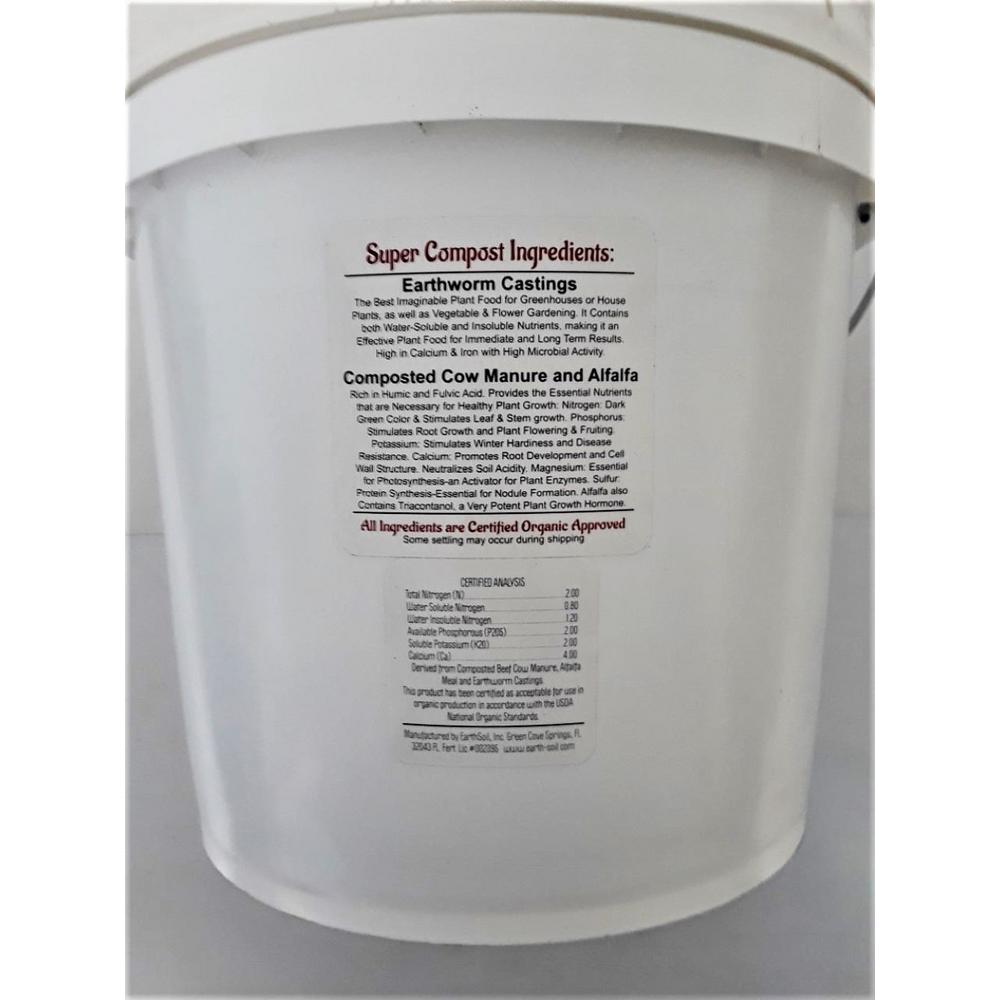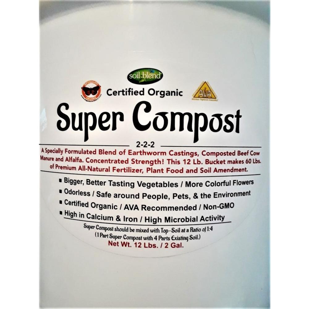 Soil Blend Super Compost 2-2-2 is a Specially Formulated Blend of Certified Organic Ingredients, Composted Beef Cow Manure and Alfalfa blended with Worm Castings. NPK of 2-2-2 and is high in Calcium, Iron, Magnesium and Sulfur. One 12 lbs. Bucket makes 60 lbs. of Natural or ganic fertilizer, plant food and soil amendment. Certified Organic/Non-GMO/American Vegetarian Association Approved and Recommended/Sustainable. You can expect Significantly Higher Yields with Larger, Tastier vegetables as well as Larger Flowers with More Colorful Blooms. This Blend has very High Microbial Activity. This is a Concentrated Blend and should be mixed with existing soil at a ratio of 1:4 (1 Part Super Compost with 4 Parts existing soil).