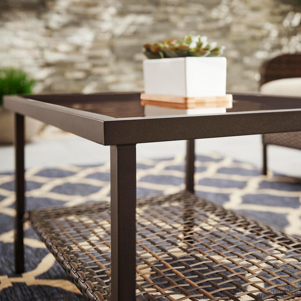 Add a relaxation spot to your outdoor space with the Gableton 4-piece Steel Wicker Promo Set. The durable steel frames are weather and rust-resistant and the resin wicker complements any decor style. The set seats four and the tempered glass top coffee table provides a convenient place for drinks and snacks. Perfect for a patio, sun room or porch.