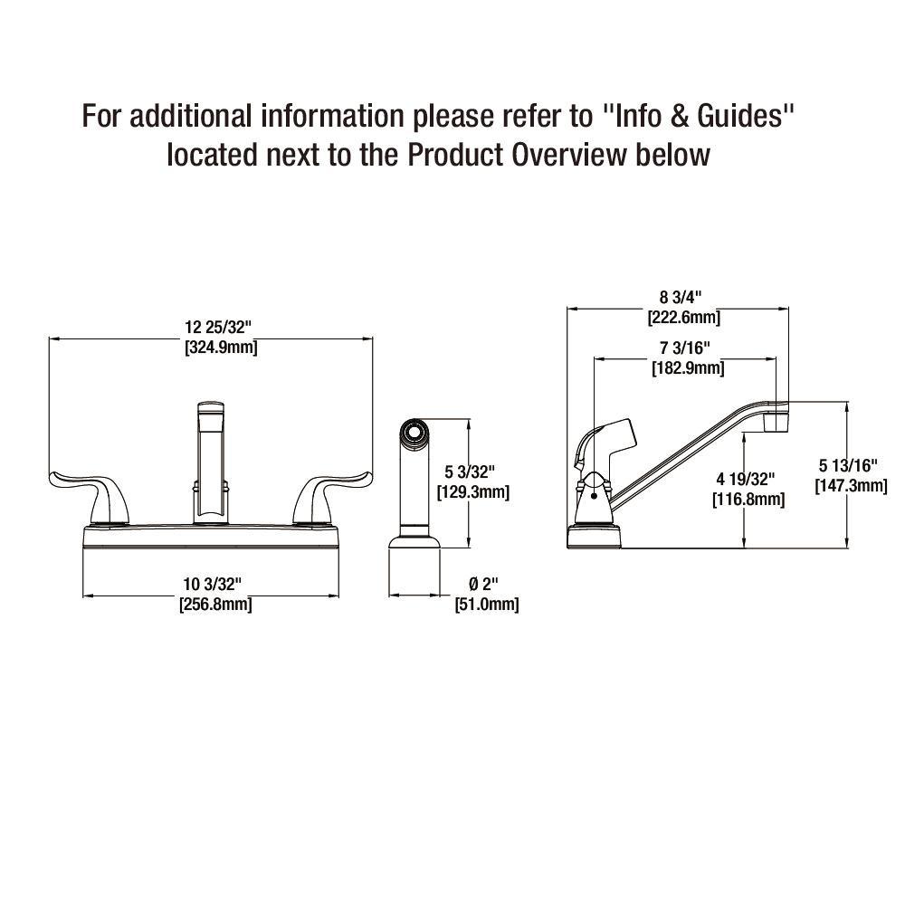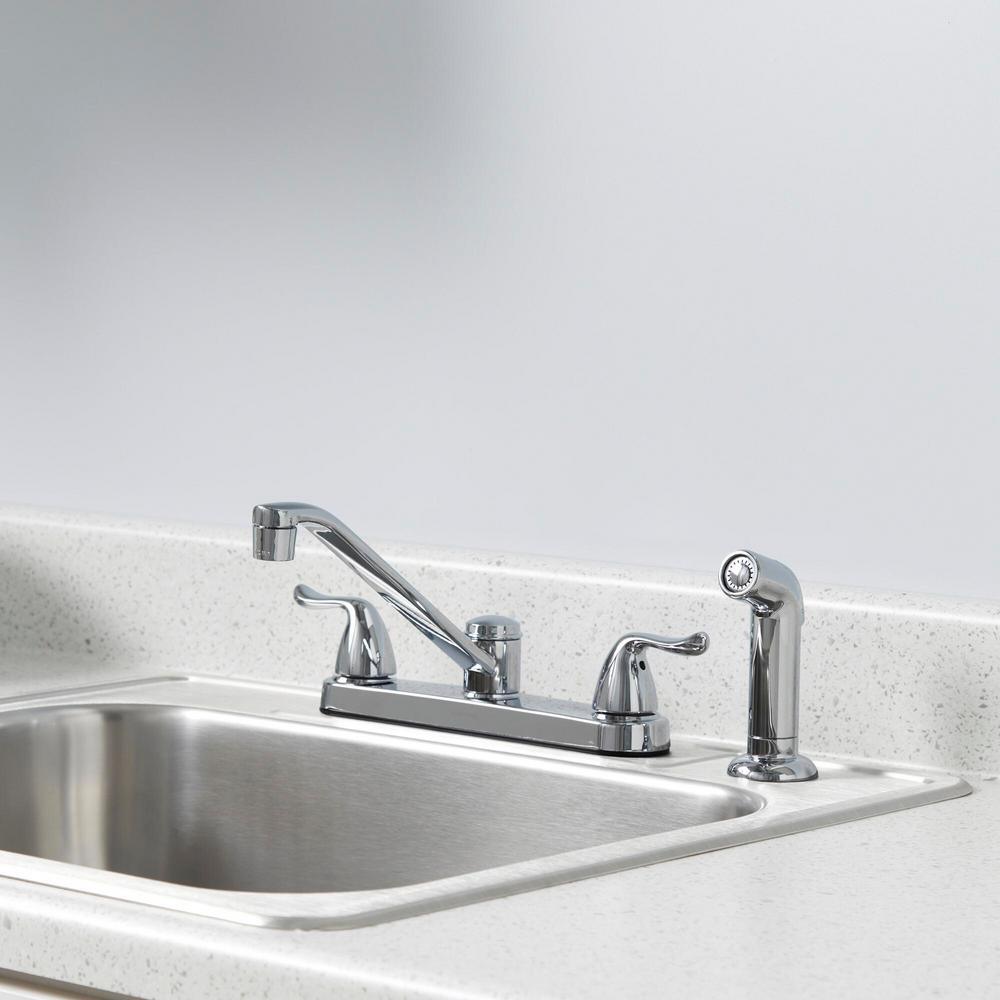 The Glacier Bay Constructor 2-Handle Standard Kitchen Faucet with Side Sprayer in Chrome complements a wide variety of kitchen decor. Combining simple design with convenient functionality, this faucet features separate hot and cold durable lever handles that make precise control of water temperature a breeze. The handy side sprayer simplifies washing dishes, pots and pans. The bright chrome finish is easy to maintain and clean. This faucet has a 1.8 GPM flow rate and washerless valves for drip-free performance. Pair with other pieces from the Constructor Collection for a complete and polished look.