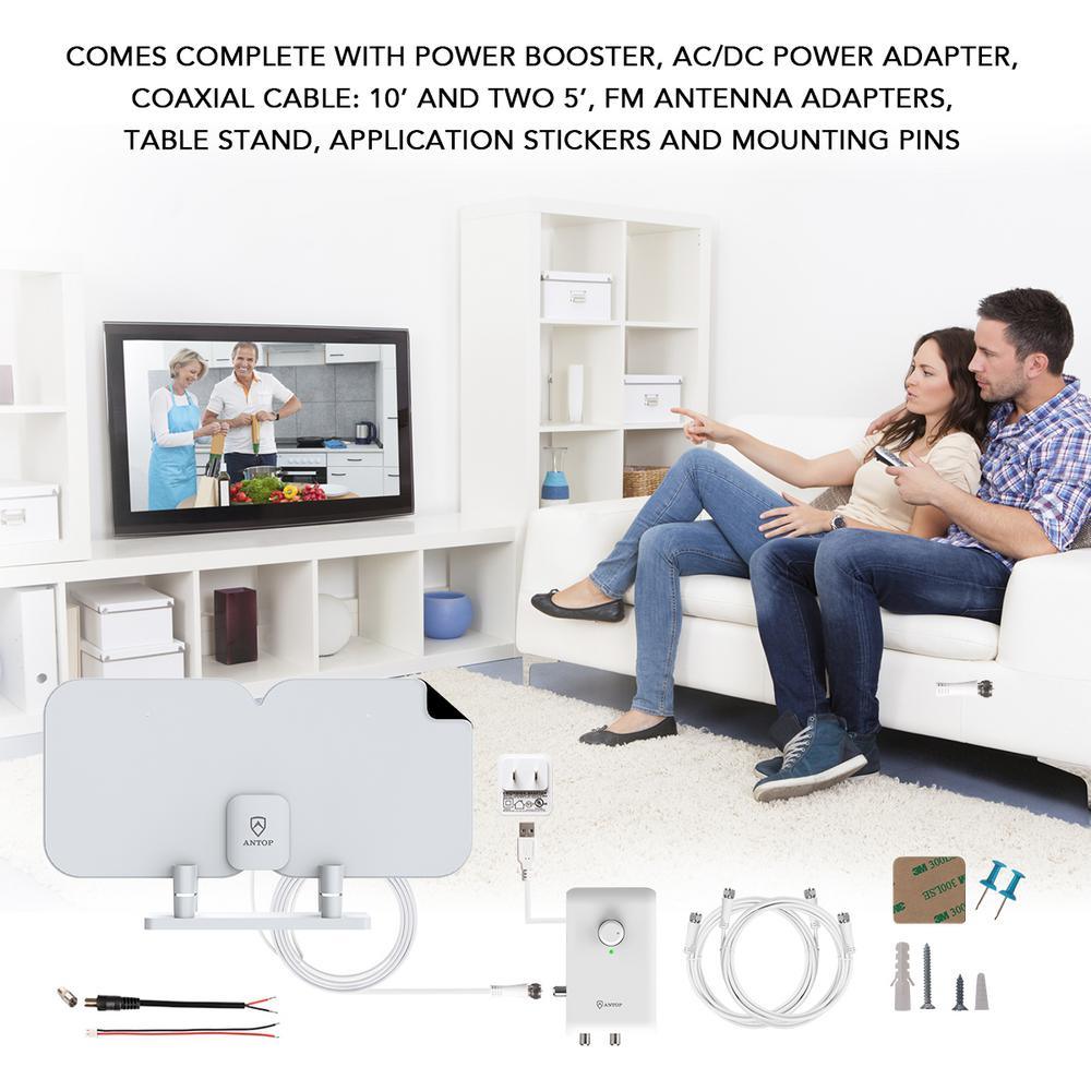 The Antop HD Smart Antenna SBS-301 design is aesthetically pleasing and suitable to match a wide range of home interior styles. The Smart Boost System adjust the antennas reception power with a simple turn of a dial and allows simultaneous connection to a second device: FM stereo, a second TV or any OTA-Ready streaming device or projector. The Multi-directional reception and creative bar design, allow you to install your SBS-301 antenna in various locations around your home: on a wall or on a table top. The SBS-301 supports HD, 1080P and 4K ULTRA HD TVs and is compatible with converter boxes. The number of TV channels and programs that you can receive for FREE depends on the amount of over-the-air broadcasters in your area. With the Antop SBS-301, there is no monthly fee and no need to subscribe. Just plug into a TV, scan the channels and then enjoy your TV shows.