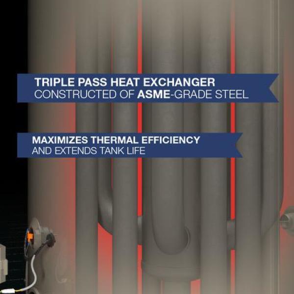 Durability features: the ASME-grade steel triple pass heat exchanger minimizes corrosion; its advanced power anodes self-adjust, and their life is monitored via the LCD or mobile app