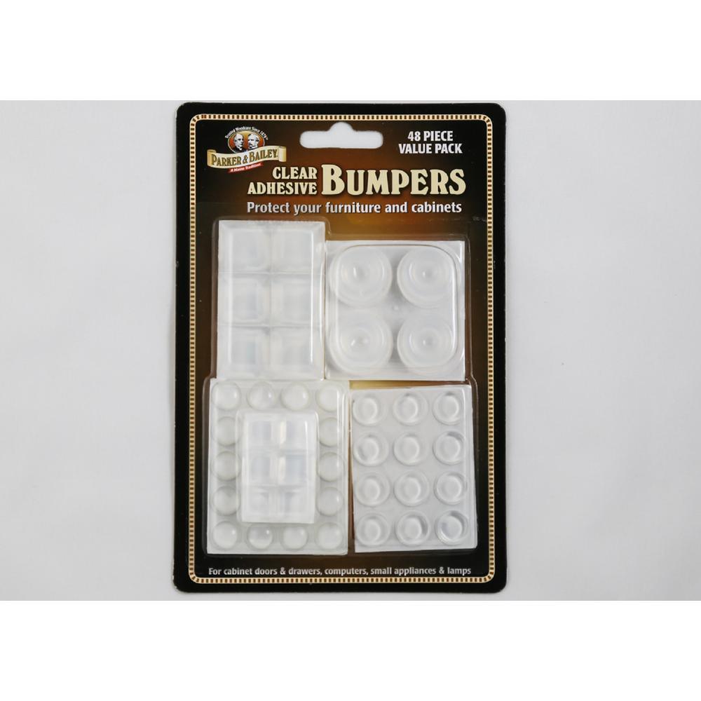 The Parker & Bailey Clear Adhesive Bumpers pack contains 48-pieces in various sizes. These clear self-adhesive bumpers protect furniture and other surfaces from marks and scratches from lamps, computers, appliances, clocks and other devices. Apply Parker & Bailey bumpers to cushion cabinet doors and drawers.
