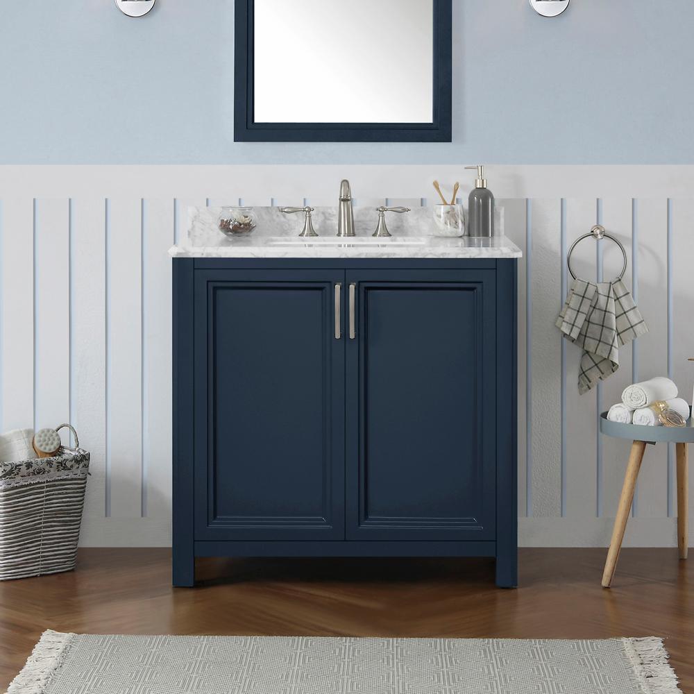 - Elegant Design: Features a midnight blue finish and Carrara marble countertop for a sophisticated look.