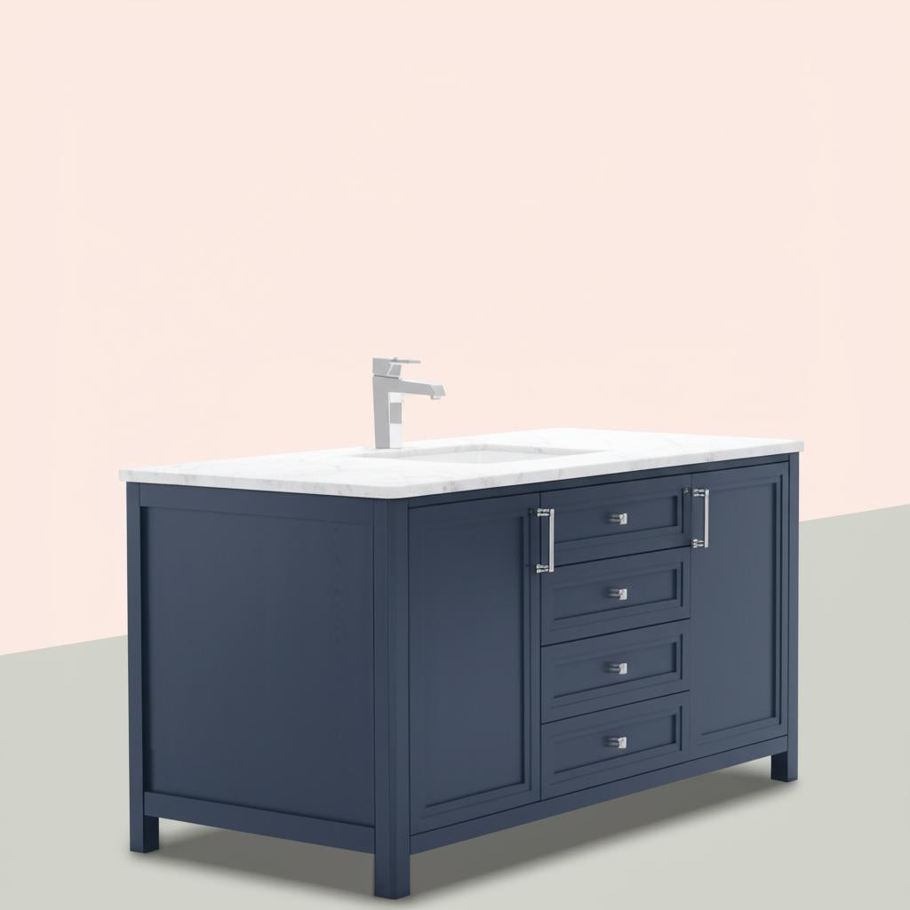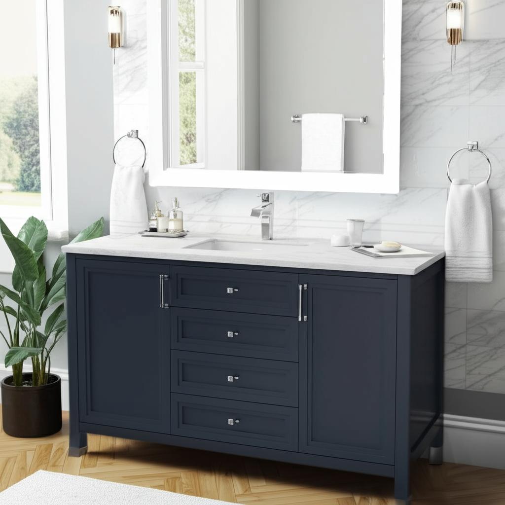 The Sandon 60-inch vanity combines timeless design with practical features, including a Carrara marble top, ample storage, and a sophisticated midnight blue finish. Perfect for enhancing any bathroom space.