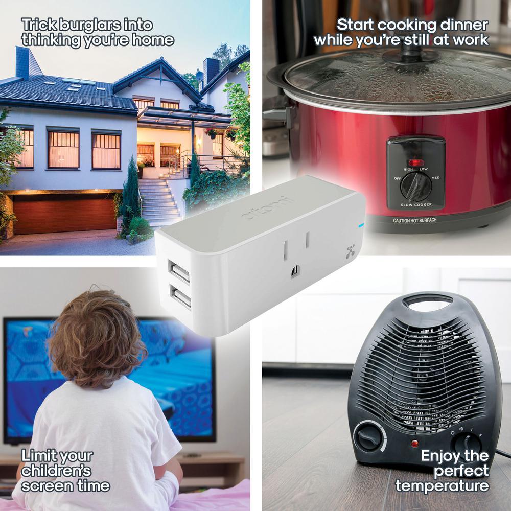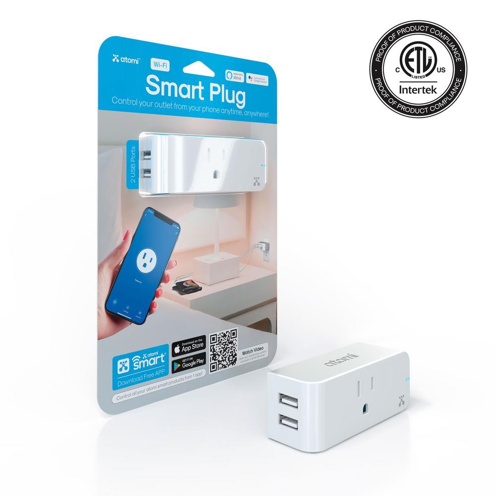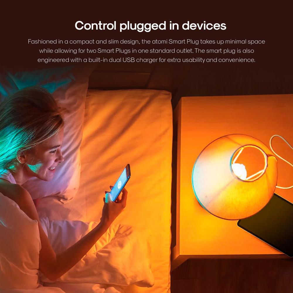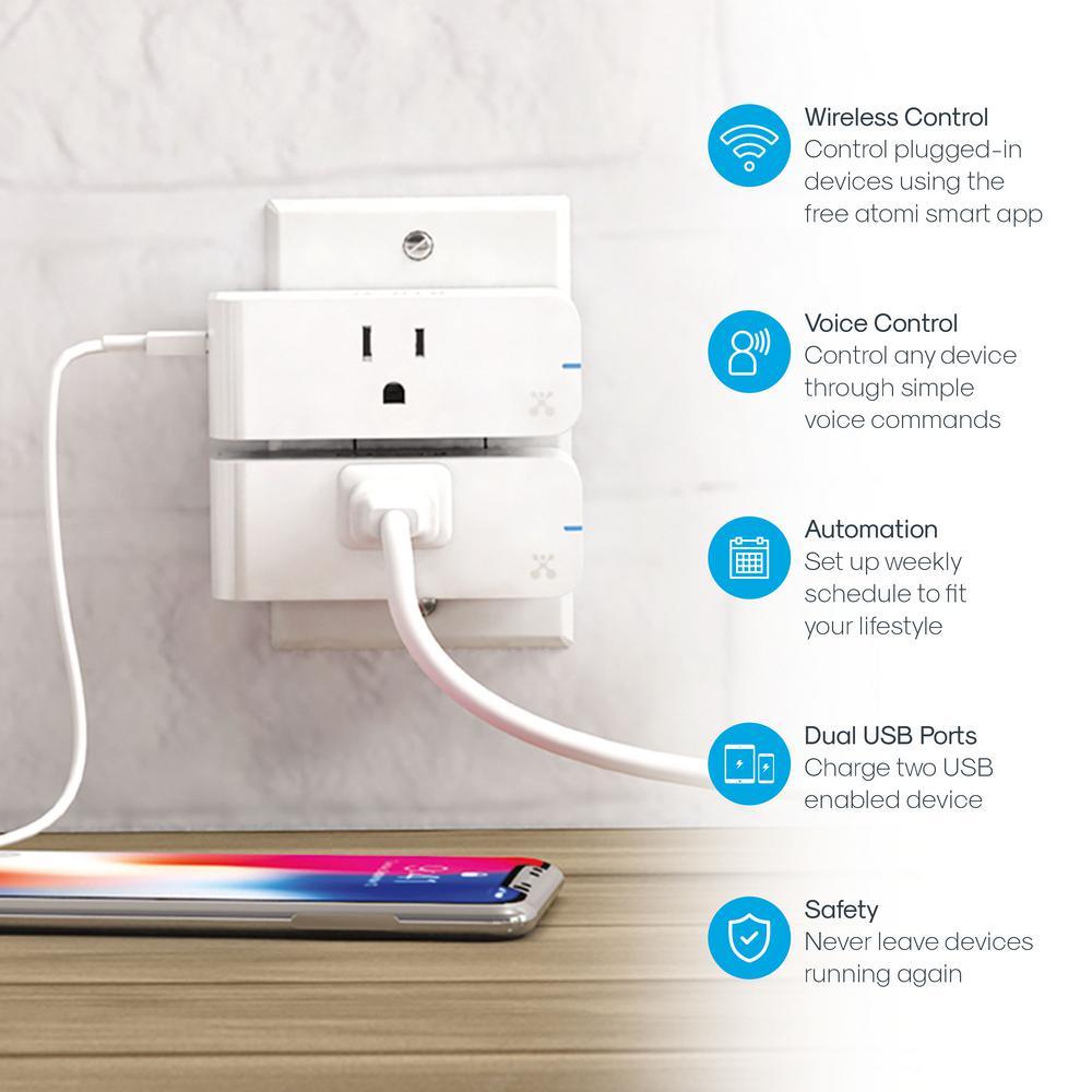Slim, sleek, smart design: the Atomi smart plug only takes up one outlet, its horizontal design doesn’t waste any space it only uses one wall plug, leaving the other outlet free, you can even plug two atomi smart plugs into the same outlet to double the automation and the number of USB fast chargers