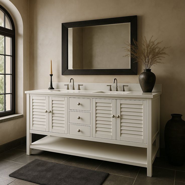 Transform your bathroom into a serene retreat with the Grace 72-inch double vanity. Its coastal chic design, featuring louvered cabinet doors and a crisp white finish, exudes timeless elegance. The cultured marble countertop adds a touch of modern sophistication, while the open bottom shelf invites creative styling with decorative baskets or plush towels. This vanity is not just a functional piece but a statement of refined taste, perfect for elevating your space.