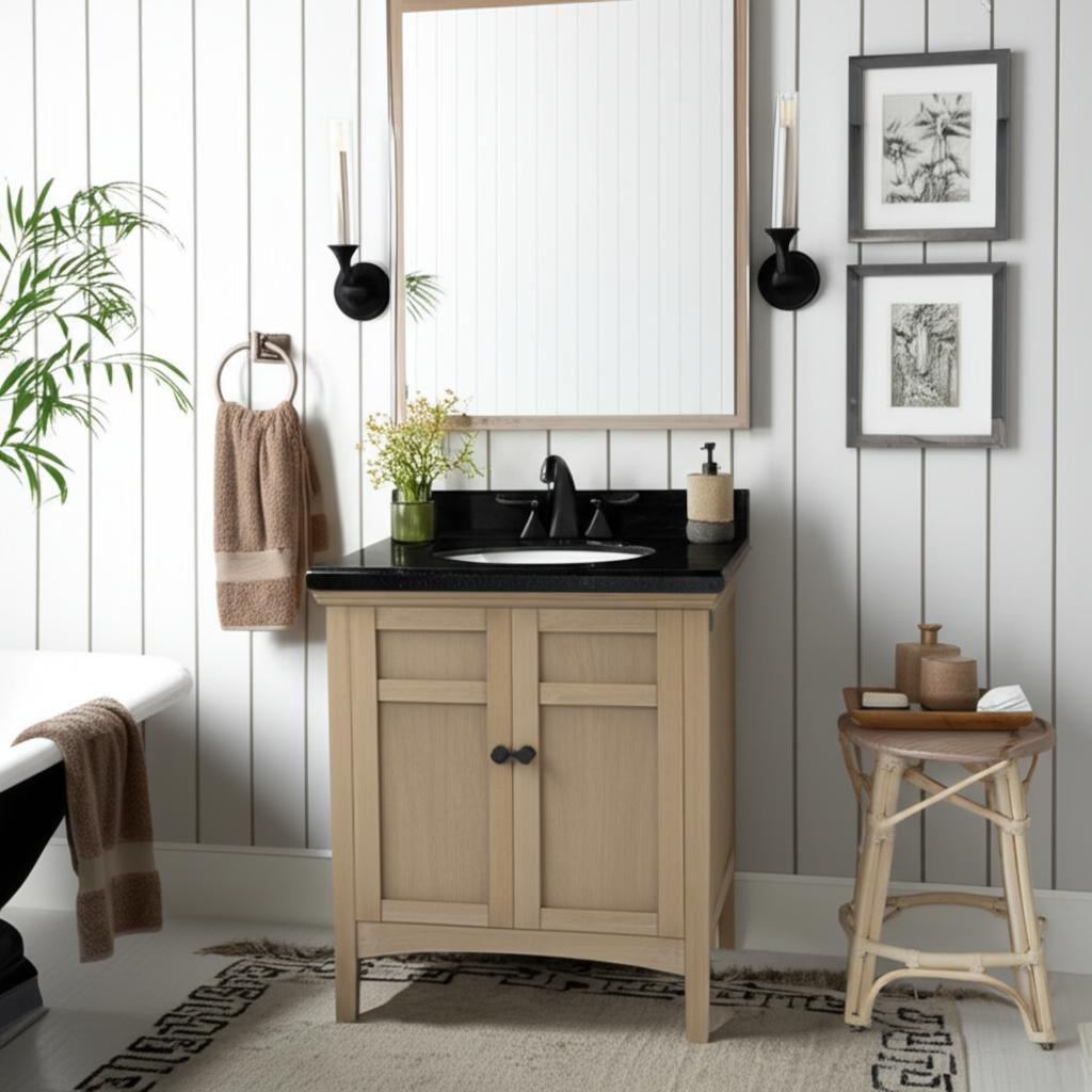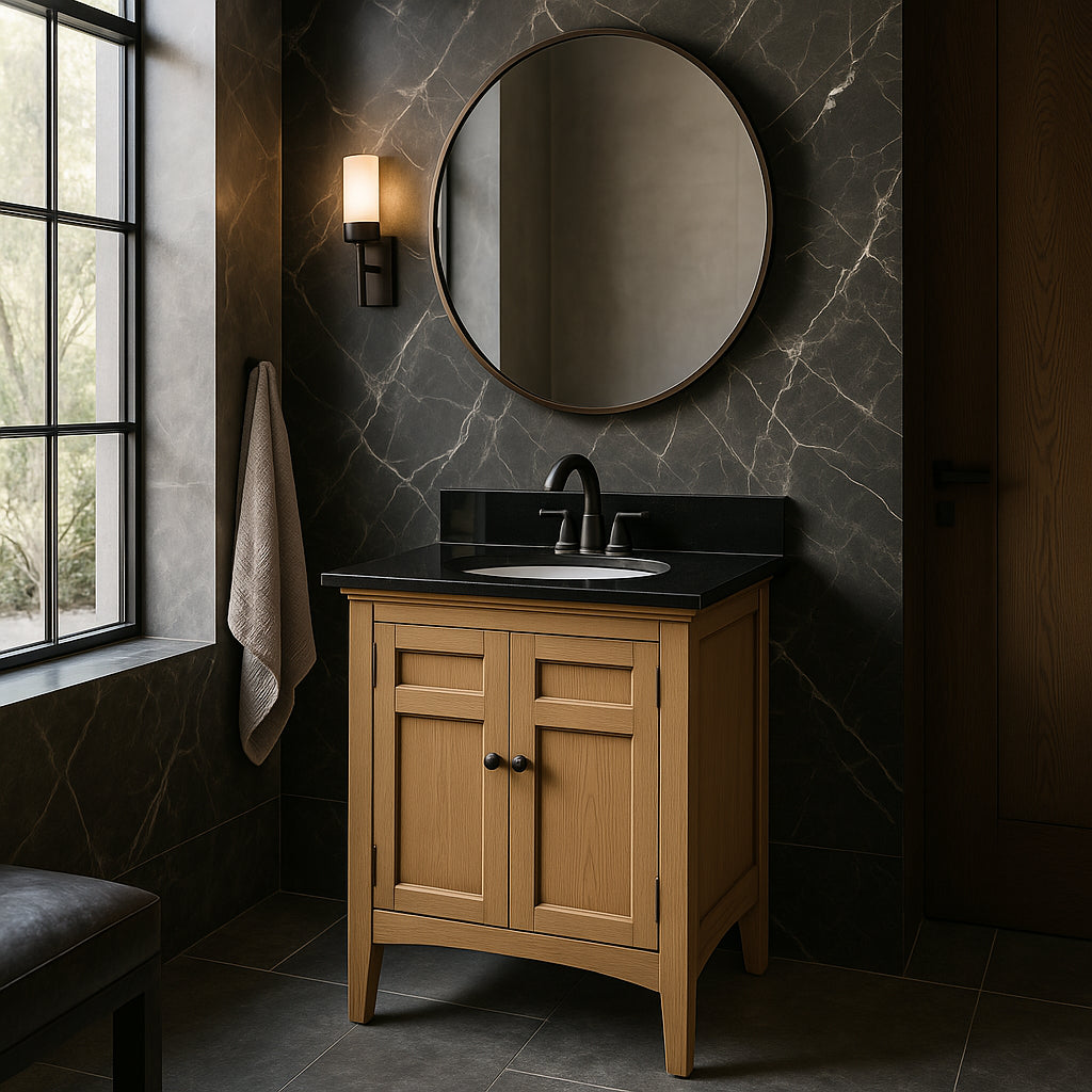 The Chartwell 28-inch vanity combines compact design with luxurious materials, featuring an almond toffee wood finish and a black granite top. Perfect for small bathrooms, it offers functional storage and timeless style.