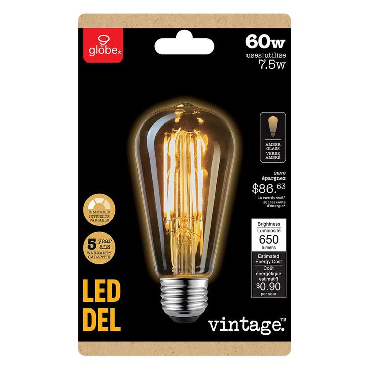 Regular price $21.95Globe Electric's 7.5-Watt (60-Watt equivalent) Vintage LED Bulb is a perfect way to add style and pizzazz to your home. The exposed tungsten filament is used to reproduce the single hairpin loop of a vintage Edison design and is ideal for architectural restoration projects, conceptual space or to bring a vintage touch to any room. Since the squirrel cage filament emits a soft warm glow and is dimmable, these bulbs work great as an accent or mood light. Pair it with a clear shade or exposed socket fixture to enjoy its ambient amber glow. This Edison inspired bulb is a Steampunk favorite creating a beautiful work of art out of any fixture and giving your room a vintage film noir aesthetic. Recommended for exposed socket or clear shade fixtures. The medium E26 base and ST19 shape works with most standard light fixtures and lamps in your home.