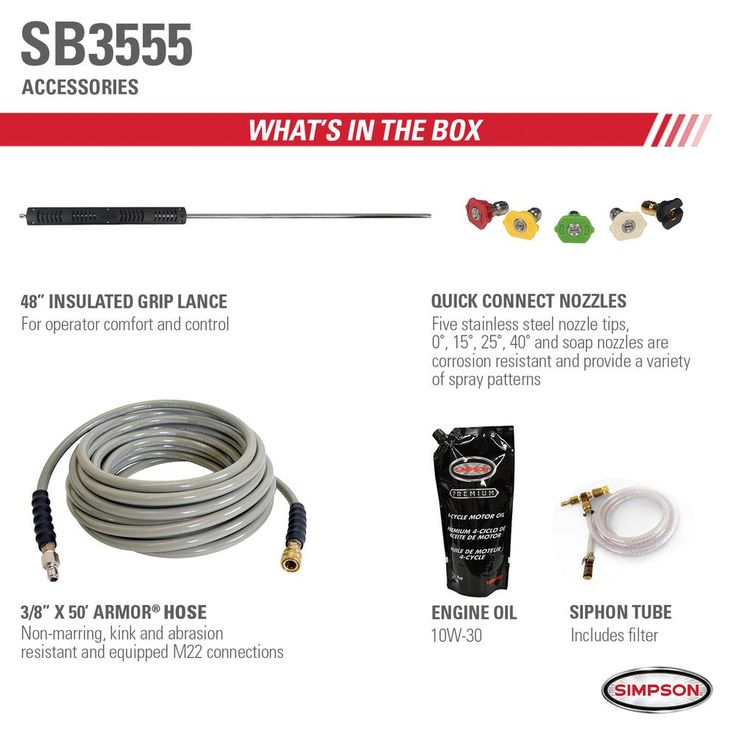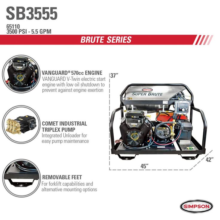 Designed for performance, the Simpson Super Brute 3500 psi at 5.5 GPM hot water pressure washer powers through industrial cleaning applications. Industry experts rely on the Super Brute for enhanced cleaning power and efficiency. The SB3555 runs on a Vanguard V-twin engine and comes with a 50 in. hose, an ergonomic spray gun and 5 Quick Connect nozzles.