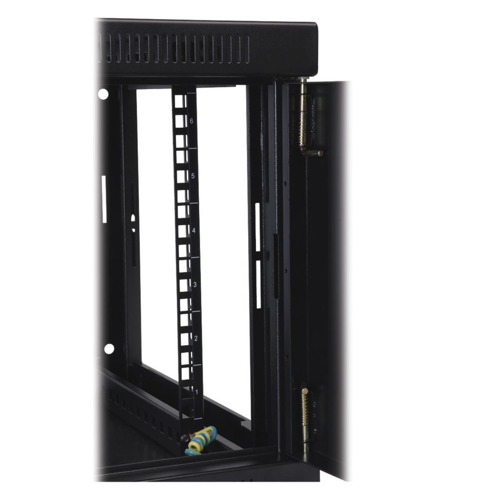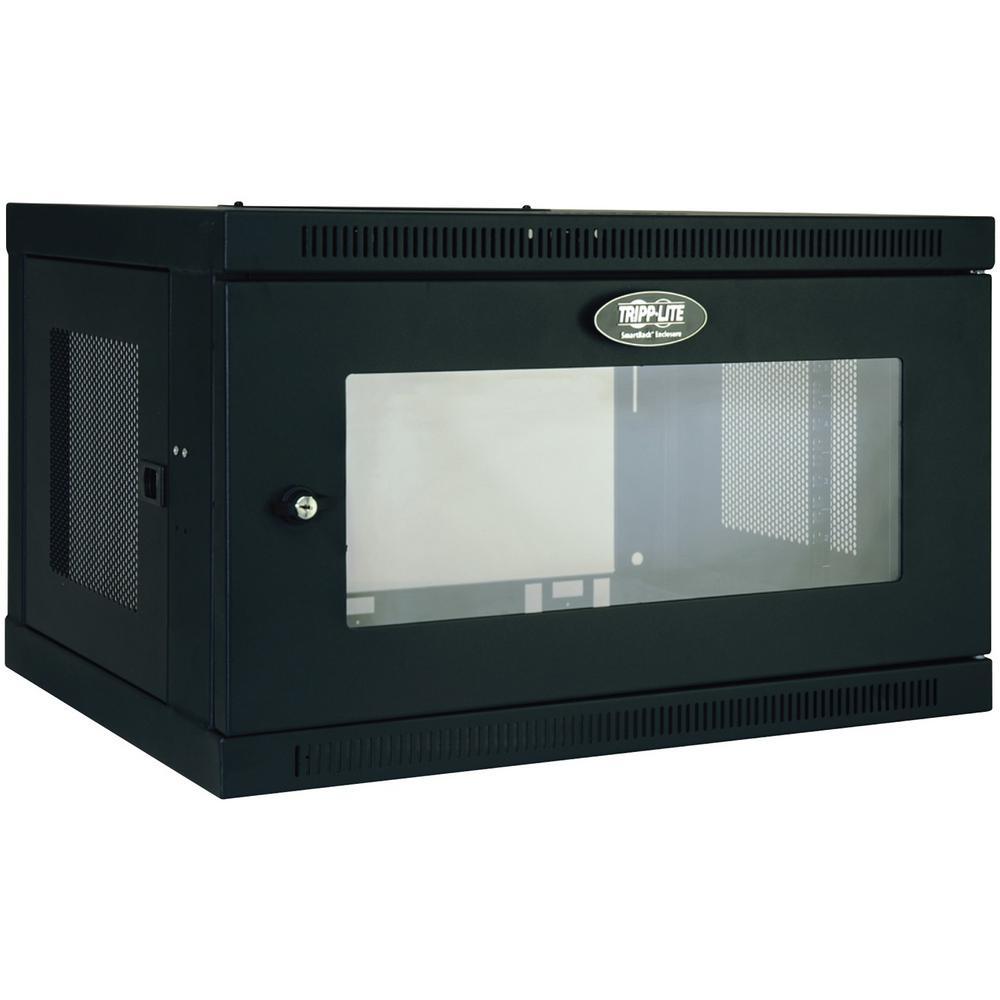 The Tripp Lite SRW6UG SmartRack 6U Low Profile Switch Depth Wall mount Rack Enclosure Cabinet with Window is designed to house EIA-standard 19 in. rack equipment in network wiring closets, retail locations, classrooms, back offices and other areas with limited floor space where you need equipment to be secure, organized and out of the way. The front door features a shatter resistant clear acrylic window that lets you monitor equipment readouts without unlocking the enclosure. Not only does the window help prevent equipment tampering and reduce acoustic noise, but it also adds visual flair to your IT installation. Constructed from heavy-duty steel with a durable black powder-coated finish, the cabinet has a maximum load capacity of 200 lbs. The doors and side panels lock securely to help prevent damage, tampering or theft. The front, top, bottom and removable side panels are vented, which allows air to flow freely and keep equipment cool. The reversible doors can open left or right by rotating the cabinet 180° before mounting. Convenient top and bottom ports allow easy cable routing. The SRW6UG comes fully assembled and ready to mount to the wall, or use Tripp Lites optional SRCASTER rolling caster kit to make it a mobile rack.