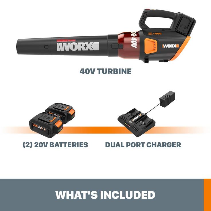 Twice the battery power of standard cordless blowers with a 3-speed + Turbo shifter. The 430 cfm – 40V TURBINE Blower is a high-performance tool that’ll make clearing your property of leaves and debris easier, and more fun, than ever before. With two 20V batteries combining for 40V worth of increased runtime and performance, this is the leaf blower for larger, more challenging lawns. The brushless motor is more efficient and runs at higher speeds while drawing less battery than motors based on a brush design. That allows for the added functionality of extra gears. 1st blows out 270 cfm (Cubic Feet per Minute) @55 mph for tight corners, 2nd is 320 cfm @65 mph, for when you get out on the open lawn, 3rd is 360 cfm @75 mph (now that’s as much as some of the more powerful blowers on the market), and Turbo tops out at 430 cfm at 90 mph for the toughest tasks. Yet, at only 7.3 lbs with both batteries installed, you can still handle all that power with just one hand. The on-board battery gauge lets you know exactly how much juice you have left in the tank, so you’ll know when you have to head back to swap out or recharge. This model comes with two 20V 2.5Ah Power Share batteries and a 2A dual-slot charger. Not only do they power this blower, but you can use them to operate any tool on the Worx Power Share platform. You’ll save money in the long run because you can share batteries between your tools.