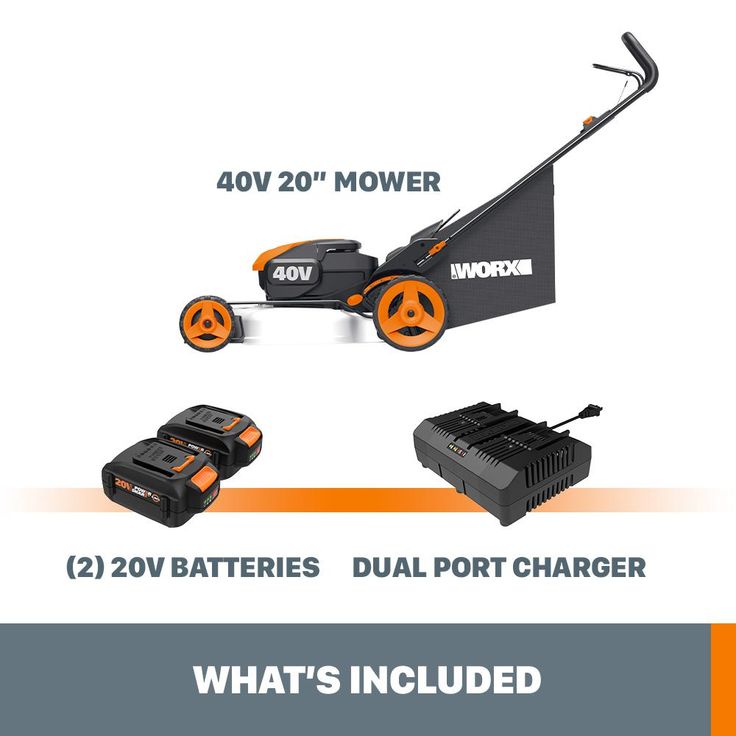 The Worx 20” – 40V Lawn Mower is a 3-in-1 mulcher / bagger / side-discharge mower that features the Nutricut™ dual-stage mulching system. Natural lawn fertilization is built right in to the design, so you can mulch whenever you want to. The durable, steel cutting deck is dent-resistant, boasts premium mulching capabilities, and built to last. And at 20” it’s wide enough so that it’ll take fewer passes to finish your lawn, but it’s still nimble enough to get in-between bushes and around landscaping features. The 7-position, single-lever cutting height adjustment makes it easy to set the right height for the season or just your preference. This mower sports a fully-collapsible handle and a unique compact stand-up storage mode so it’s easy to put away in a corner or even on a shelf during the off-season. Two 20V 5.0Ah batteries are included with this model. The on-board battery level indicator lets you know when it’s time to return to swap out or recharge those batteries. And the dual-port charger that also comes with this mower will get those batteries, and any Power Share batteries you have, ready for use again quickly. You can expect to mow up to ¼ acre on a single charge with this mower, depending on conditions and terrain, of course. The collection bag holds 1.4 bushels and is easy to empty or remove for side-discharge. And the unit weighs 53.6 lbs, which considering the rugged steel deck, isn’t too heavy.
