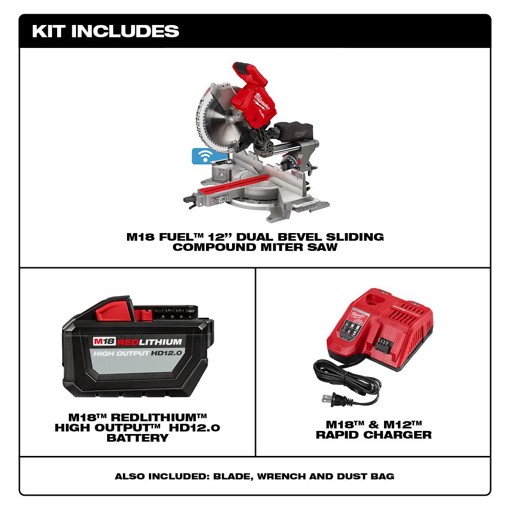 Q: What is included in the kit? A: The saw, 12 in. blade, one M18 REDLITHIUM HIGH OUTPUT HD12.0 battery, M18 & M12 rapid charger, handles, and clamp.