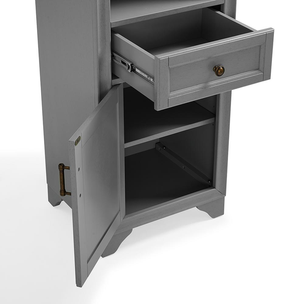 The Tara linen cabinet offers much-needed organization to narrow bathrooms, hallways, kitchens, and beyond. This linen cabinet is modeled in a cottage style with its vintage detailing, distressed white finish and antique bronze hardware. With its tall silhouette and spacious shelf space, this valet offers abundant storage while taking up minimal floor space. Store, or display. The choice is yours and the possibilities are endless.