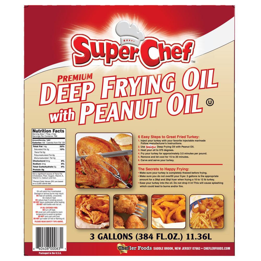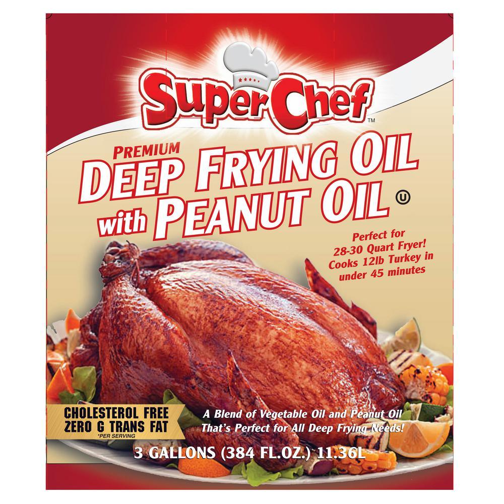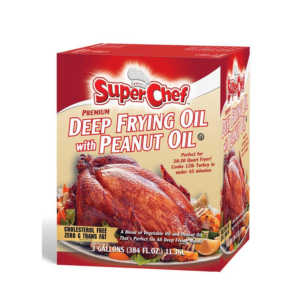 Enjoy the exceptional flavor and moisture of fried turkey with this premium blend of vegetable oil and peanut oil. After all, the turkey is the centerpiece of your holiday meal. There is really nothing like it. This 3 Gal. pack is perfect for your 28 Qt. to 30 Qt. fryer. or, use whatever amount of Deep Frying Oil you need and keep the rest in its resealable container. Cooks a 12 lbs. turkey in 45-minutes. This Deep Frying Oil is also ideal for all of your frying needs. Examples: chicken, fish, onion rings, hush puppies, vegetables, etc. Enjoy your outing and impress your family and friends like a pro. Super Chef Deep Frying Oil is Kosher, Cholesterol Free and has Zero Trans Fat.