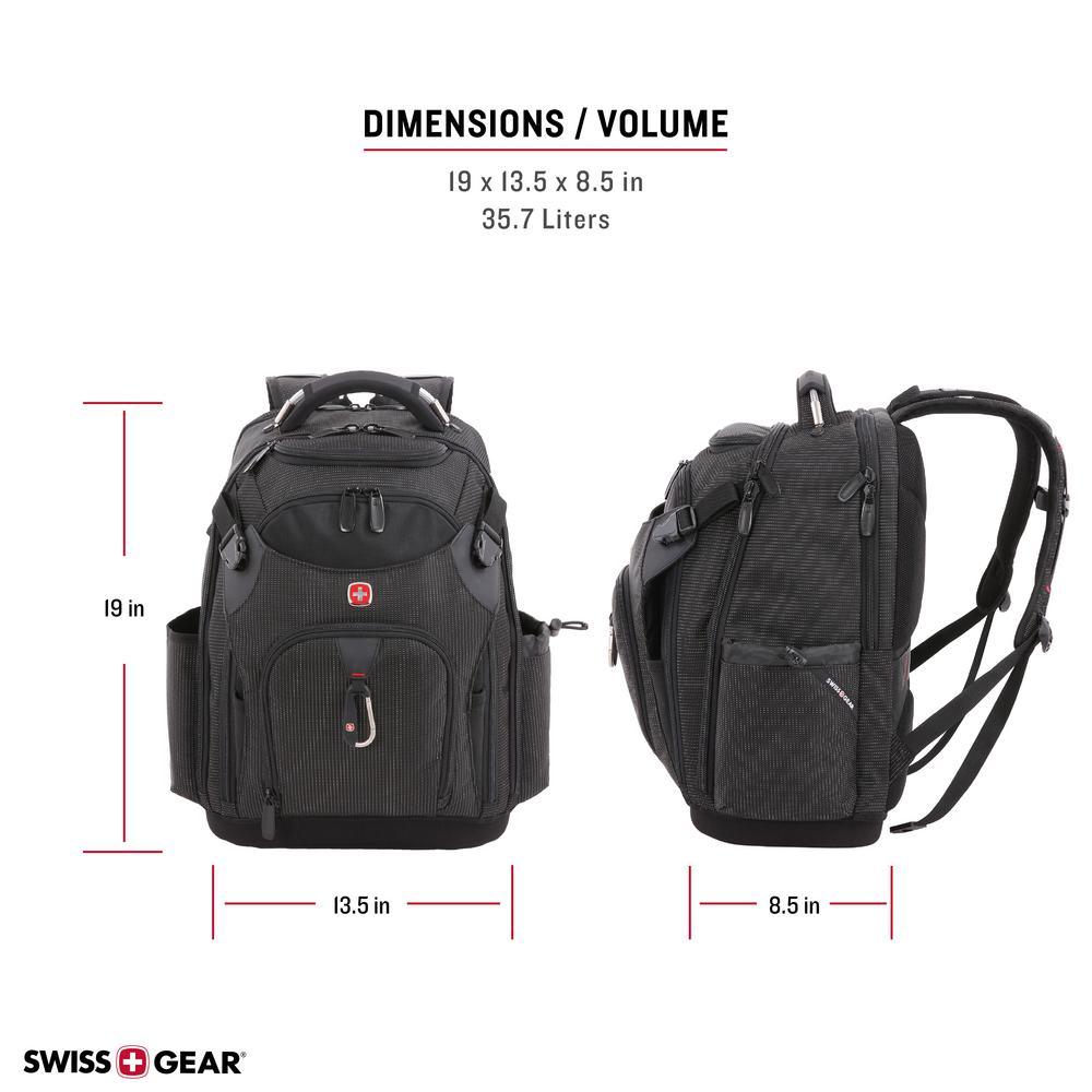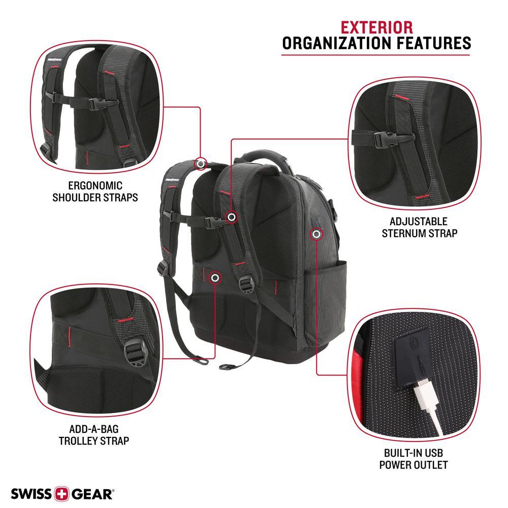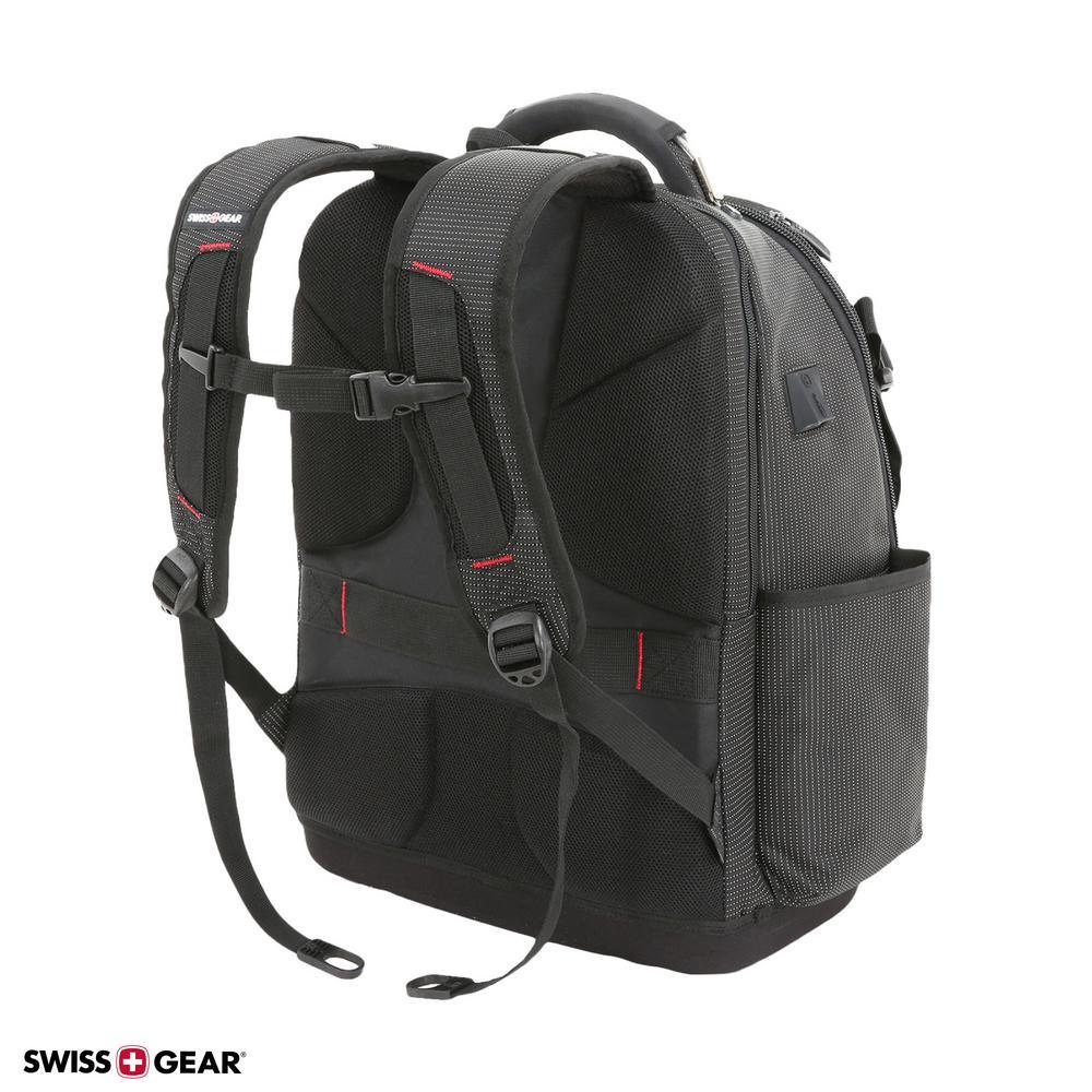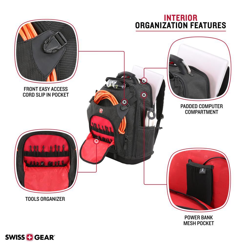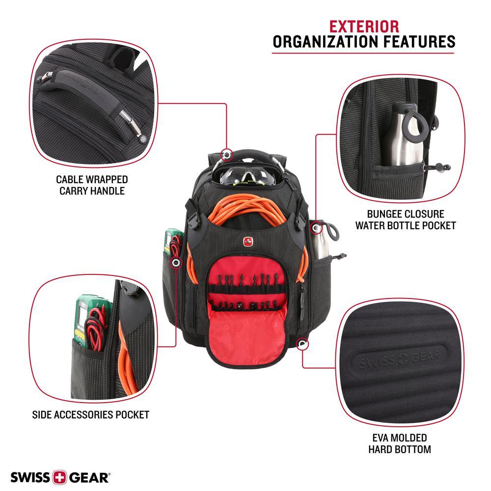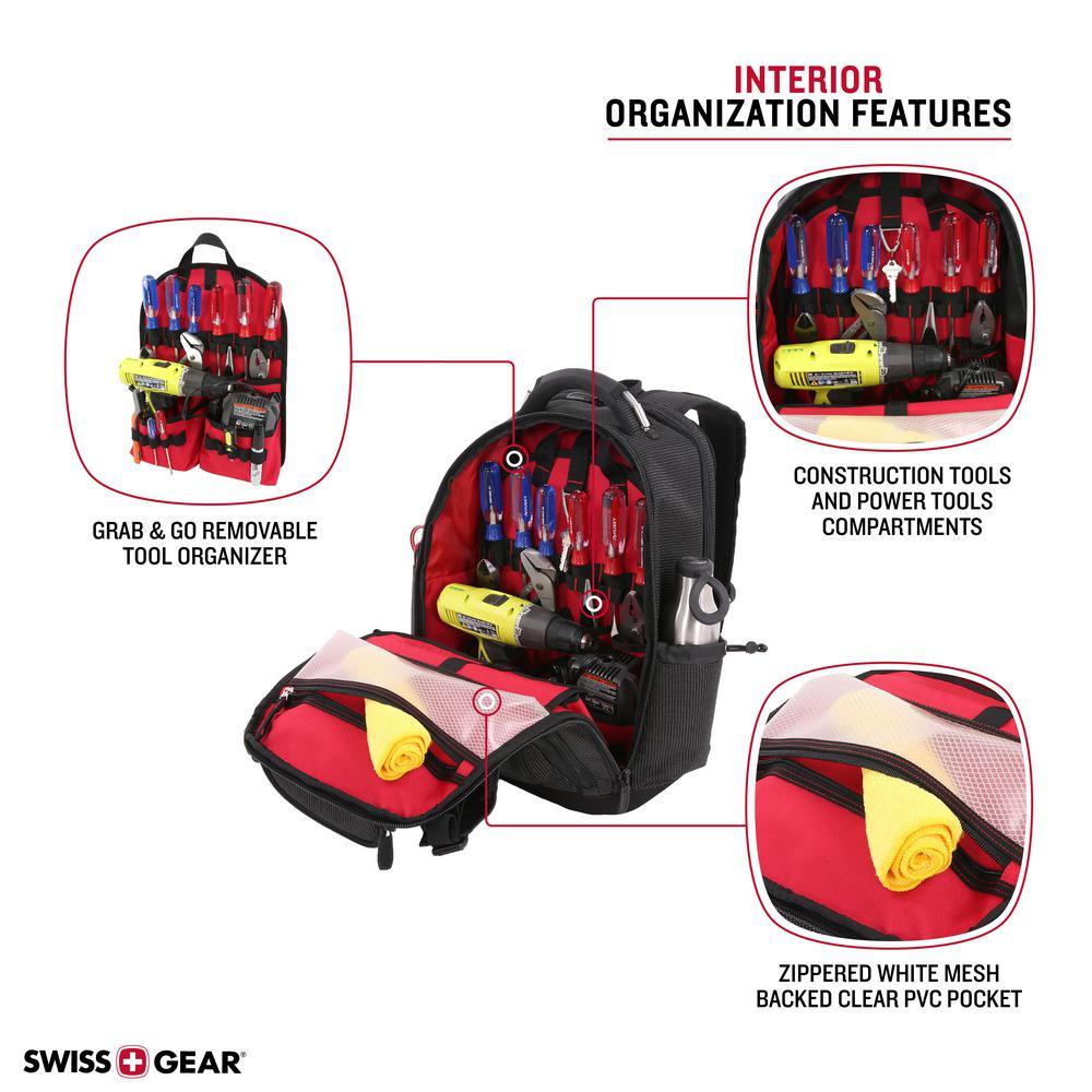Ready for it all and Engineered to carry all your work tools and devices, this SWISSGEAR 3636 Work backpack combines the portability of a toolbox with the modernity of a backpack. Its rugged construct features a designated 17 laptop compartment, a built-in USB port and 3 zip compartments with more than 60 organizer slots for hand tools, nails, hammers and drills. An external front pocket integrates 20 divider slots to accommodate a range of tool sizes while a second zip pocket includes 2 large slip pockets and multiple slots to store a measuring tape, rulers, screwdrivers and other supplies. Inside the main compartment, find a removable grab-and-go tool caddy as well as a wet/dry PVC pocket and a hook and loop closure pocket. Stash large cable cords inside a front slip section and protect your safety glasses inside a hard-molded top pocket. A side cinch water bottle pocket along with an Airflow technology back panel and shoulder straps provide lasting comfort on the worksite. An EVA molded hard bottom keeps this pack standing upright so you can reach in and out of each compartment seamlessly.