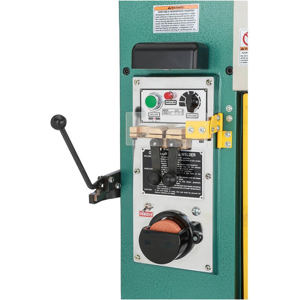 This 18 in. Vertical Bandsaw has been built with the quality, features, and durability needed in today's busy shop. The extra-large table tilts side to side and front to back, allowing for the squarest cuts, even with tight contour work. Variable-speed blade control is available with just a turn of the handle, so you can handle even the toughest cutting jobs. The built-in blade cutting and welding station with 1/8 HP grinder is easy to use, so you can make your own blades and save money. The blade welding station also lets you create seamless inside cuts by cutting the blade and re-welding it inside your workpiece. The durable cast-iron top end and platform provides a rock-solid, vibration-free table area that will last for years to come.