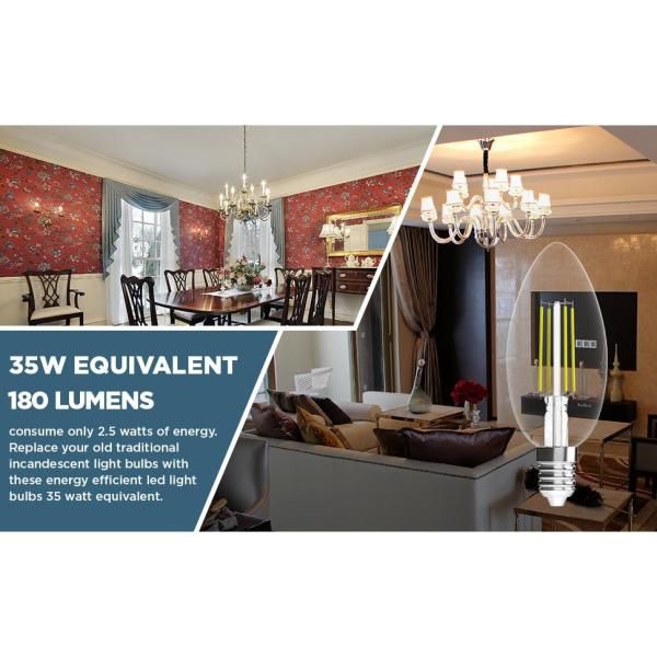 Regular price $21.98These days, decor goes beyond simply adorning your home as functionality plays a huge role in home improvement. Our chandelier LED light bulbs use this principle in the core of their design and development. The result: E12 LED Candelabra Light Bulbs that upgrade your decorative lighting fixtures while cutting costs and installation time. At a mere fraction of the yearly energy cost of the average incandescent alternative, these LED bulbs are the perfect 35-Watt equivalent. With just 2.5-Watt of energy consumption, they save you more while outperforming the competition. Their 5000K daylight brightness with 180 Lumens each makes for a night and day difference from your previous lighting solution. Chandelier LED Light Bulbs to create an inviting atmosphere with its cool white tones, these 35-Watt equivalent, 5000K light bulbs use 180 Lumens to create an elegantly bright home that your family will love, Our chandelier light bulbs also have a candelabra base with a E12 socket to ensure easy-installation. So, if you want to save on time and money with our user-friendly bulbs, these are perfect for you.