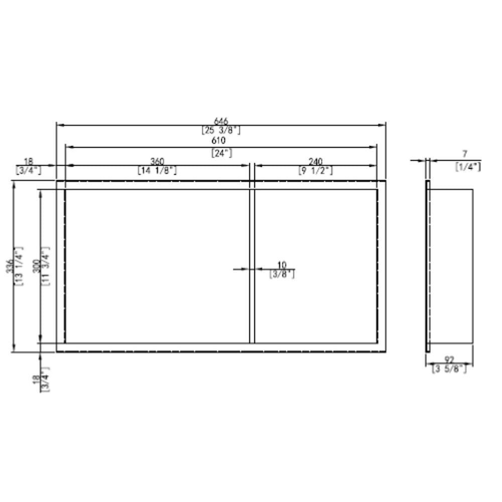 - Leak proof niche is a 12 in. x 24 in. rectangle that is 3-5/8 in. deep, with a 1/4 in. lip around the perimiter, the inner shelf divides the space 40% and 60% (a bigger and a smaller space)