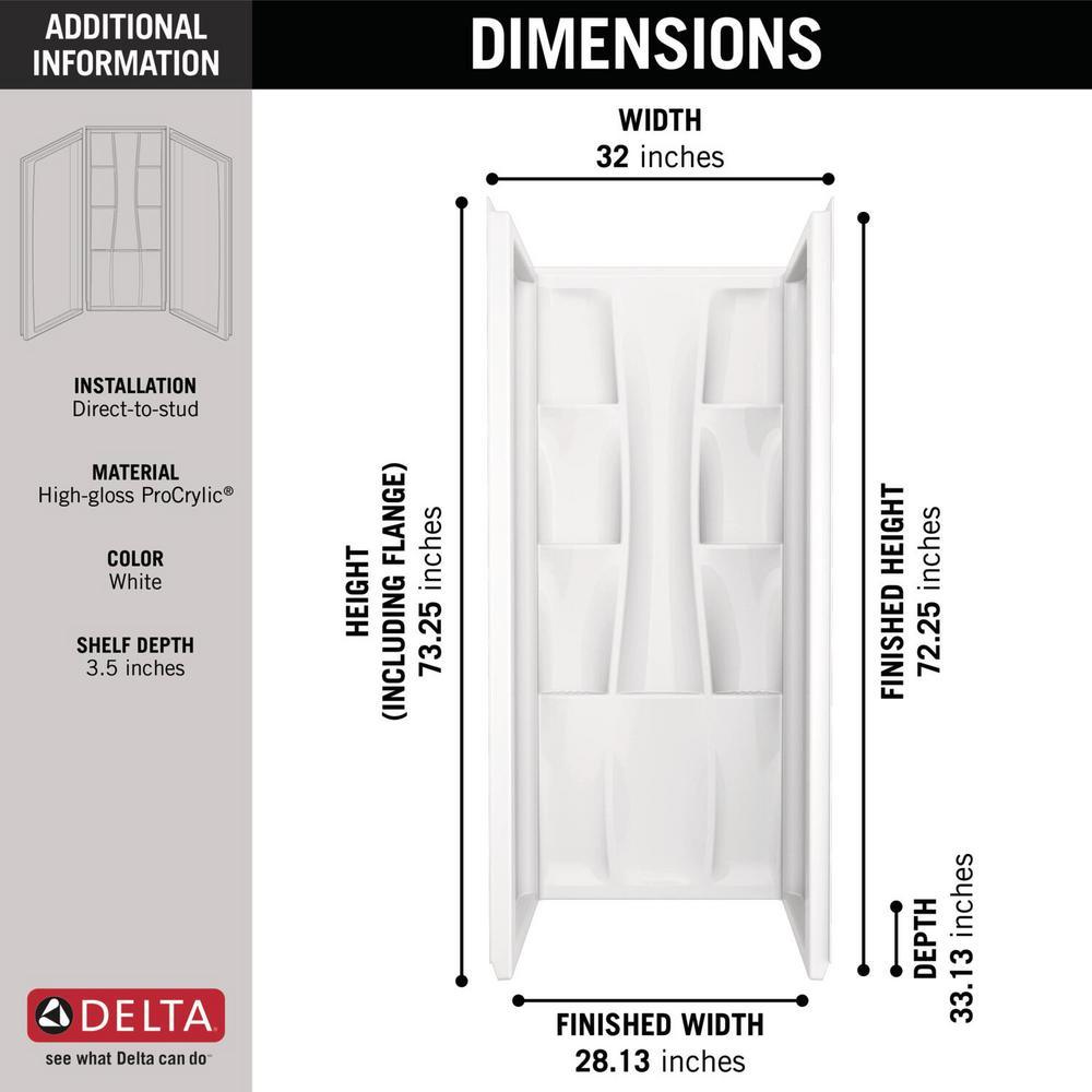 The Classic 400 32 in. x 32 in. x 74 in. 3-Piece Direct-to-Stud Alcove Surround in White offers strength without sacrificing design or style. It features a premium high-gloss and nonporous acrylic surface that is durable and easy to clean. It was designed for direct-to-stud installation to give you a long-lasting and secure unit.