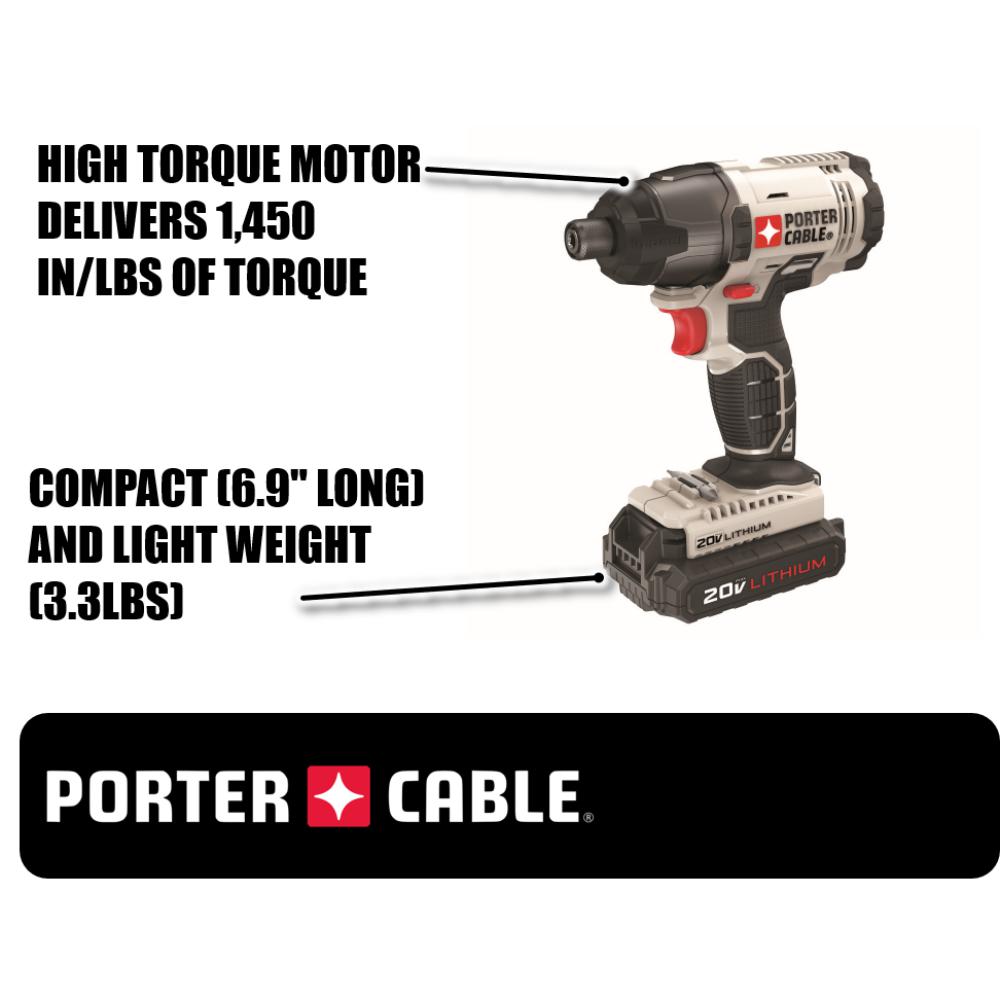 Our 20-Volt MAX in. Hex Head Compact Impact Driver Kit is built to drive decking screws, drywall screws, lag screws, lag bolts, self-tapping screws and ledger lock screws. It features a high-torque motor that delivers 1,450 in./lbs. of torque for quick fastening. This unit is compact and lightweight, allowing you to work in tight areas with minimized fatigue. It has a quick-release in. hex head chuck for easy 1-handed bit changes. An on-board battery gauge displays remaining charge and an LED brightens dark work areas.