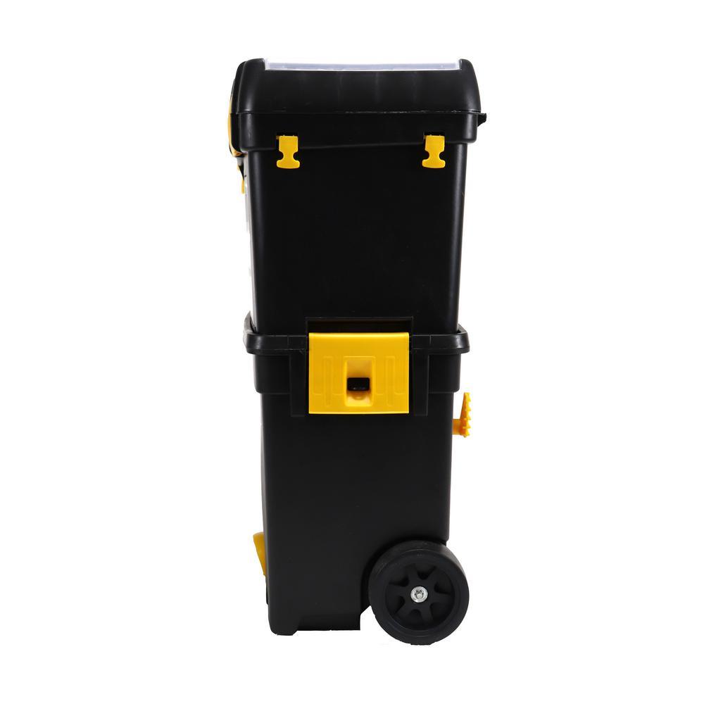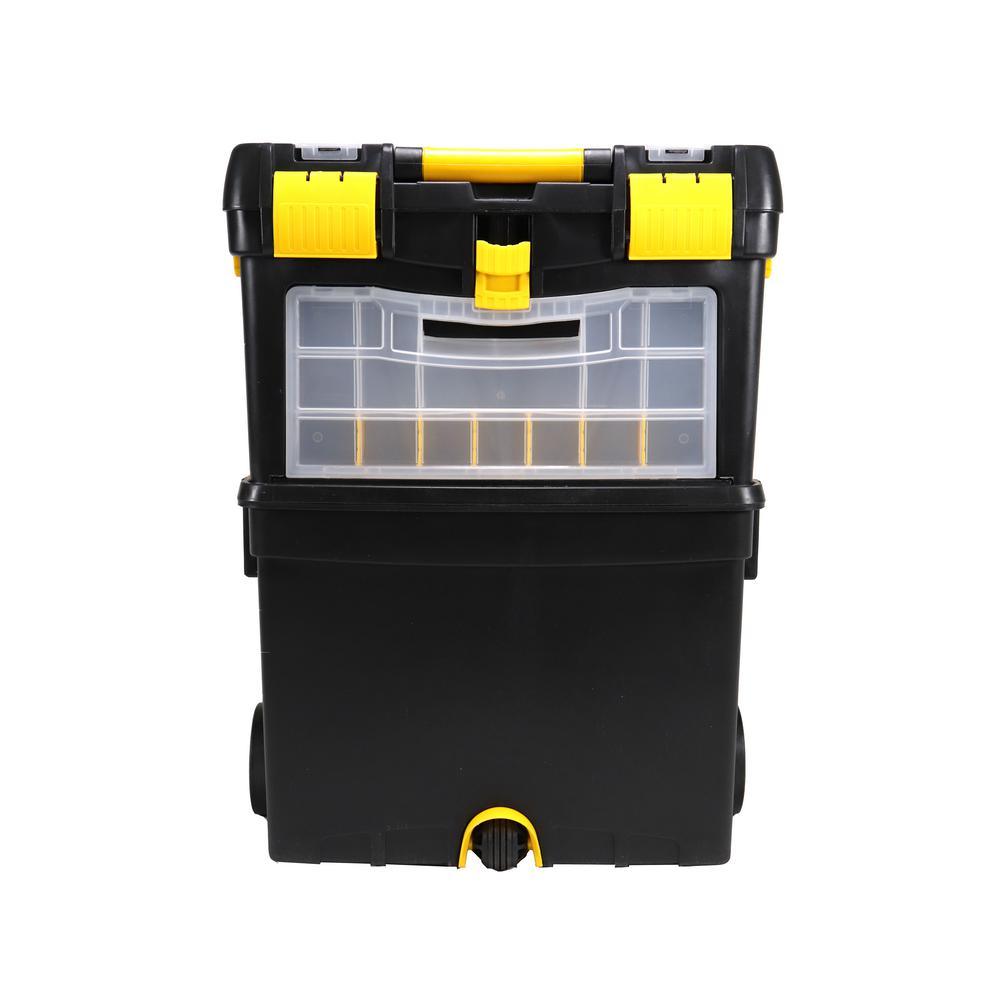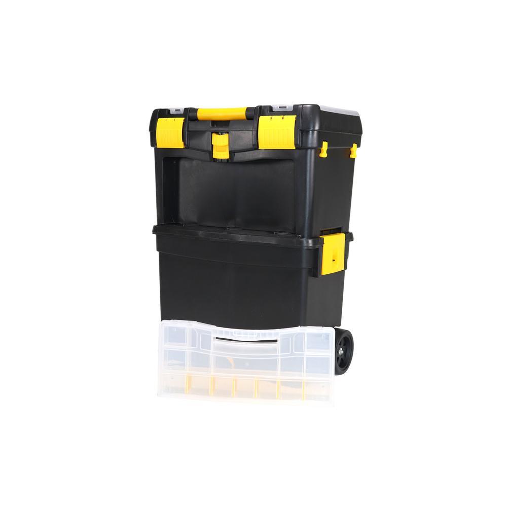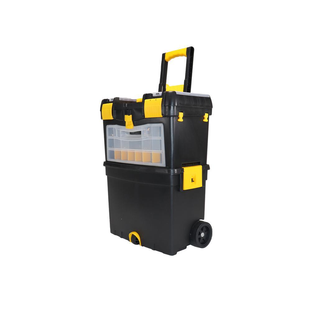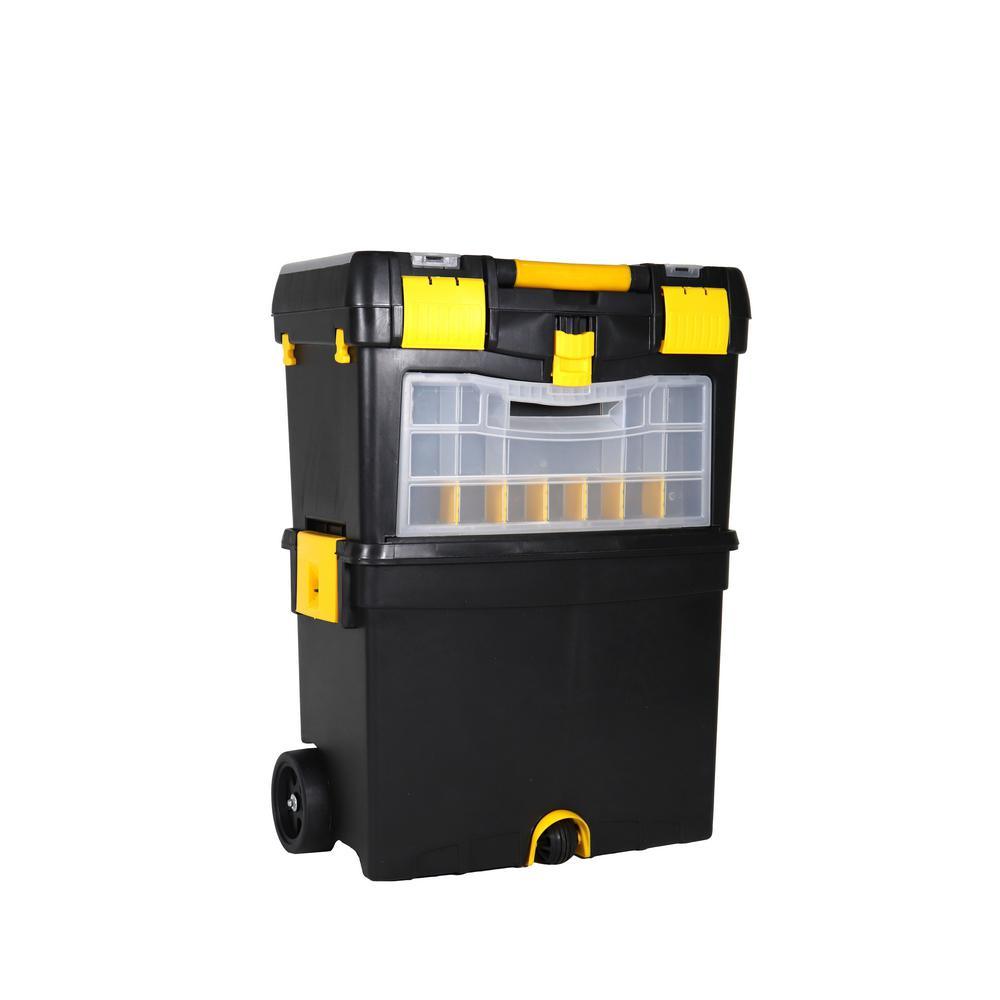 The Erie Tools 2-Tiered Rolling Toolbox keeps your tools organized and easily accessible while on the go. Made of durable polypropylene to keep your tools and accessories safe and secure on the toughest job sites. 2 yellow polypropylene side latches secure the top and bottom toolboxes together (4-1/8 in. x 3-1/4 in.). The Top Tier Toolbox features a comfort grip, foldable handle with 5-3/4 in. sliding lock latch. Equipped with a detachable clear polypropylene miscellaneous hardware organizer carrying case with 14 sections, embedded in the front face of the Top Tier Toolbox that can be used for storing nuts, bolts, screws, washers, nails, anchors and other pieces of small hardware. The Bottom Tier Toolbox features a removable tool tray and 2 yellow polypropylene hooks (on the back side) spaced apart at 12-1/4 in. that are used for hanging a coiled extension cord. Features drill bit storage molded into the tool tray. Stores up to 8 Bits and is divided into 2 sections. Features 2 4-1/4 x 2 in. Black Polypropylene Back Wheels and 2 Hard Black Polypropylene Ball-Shaped Front Wheel with Yellow Propylene Protective Hood.