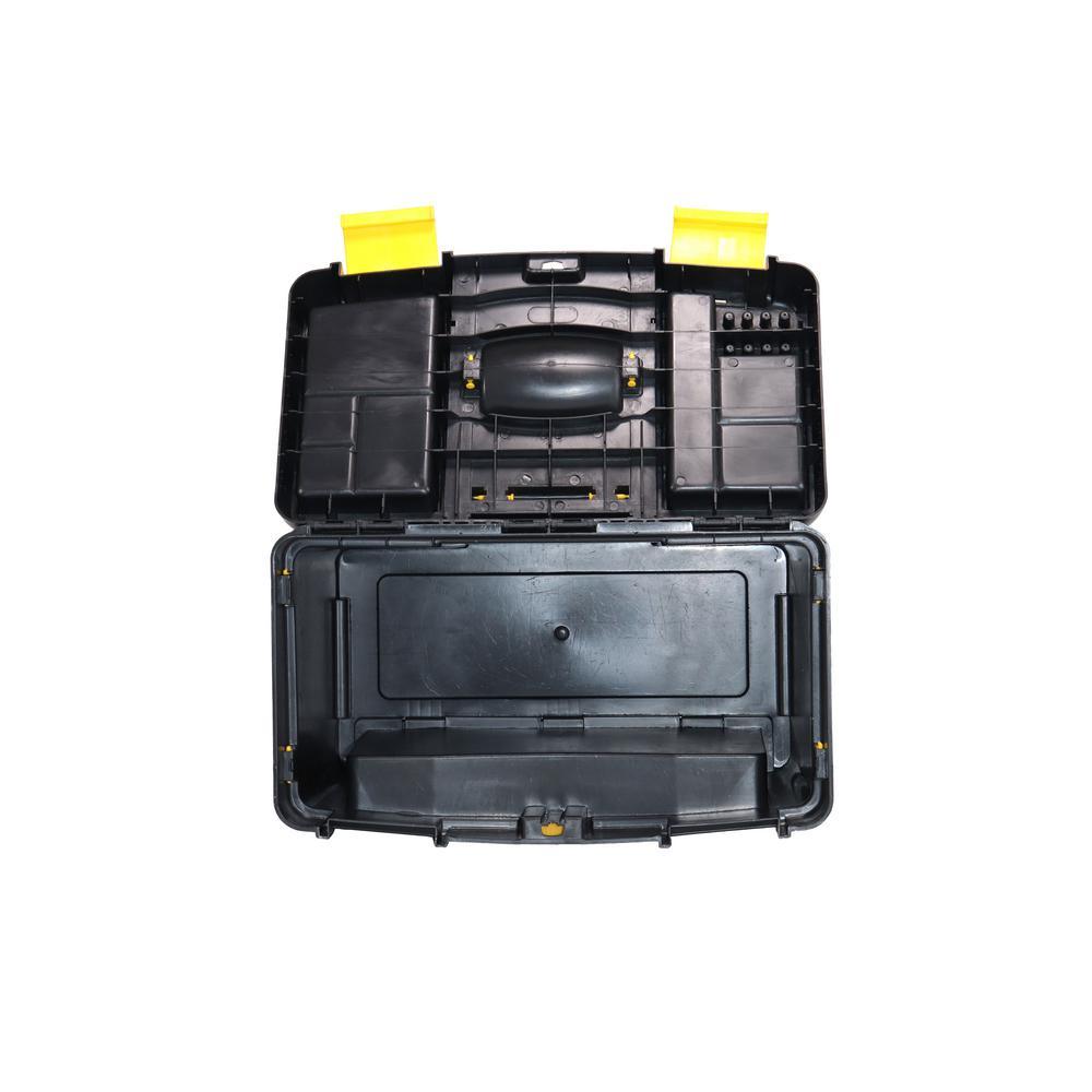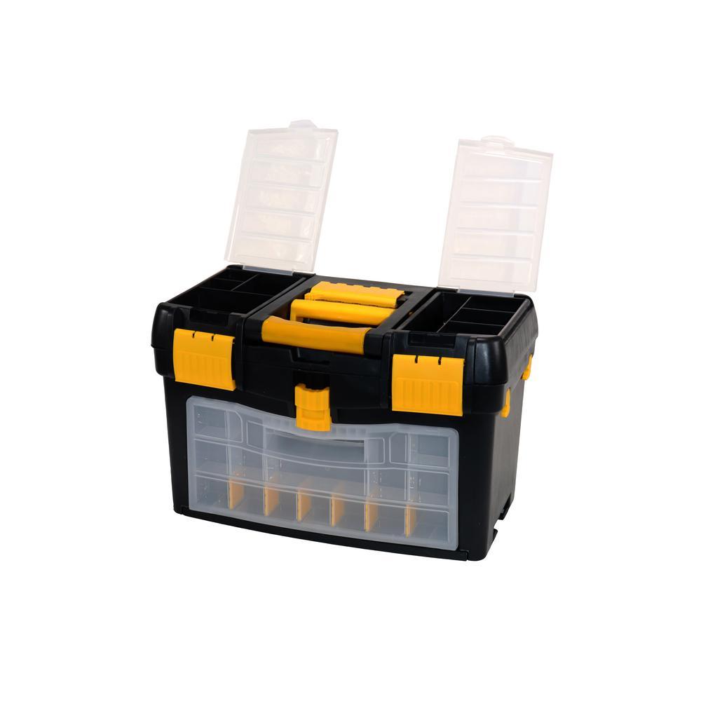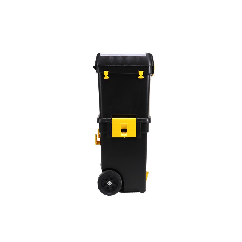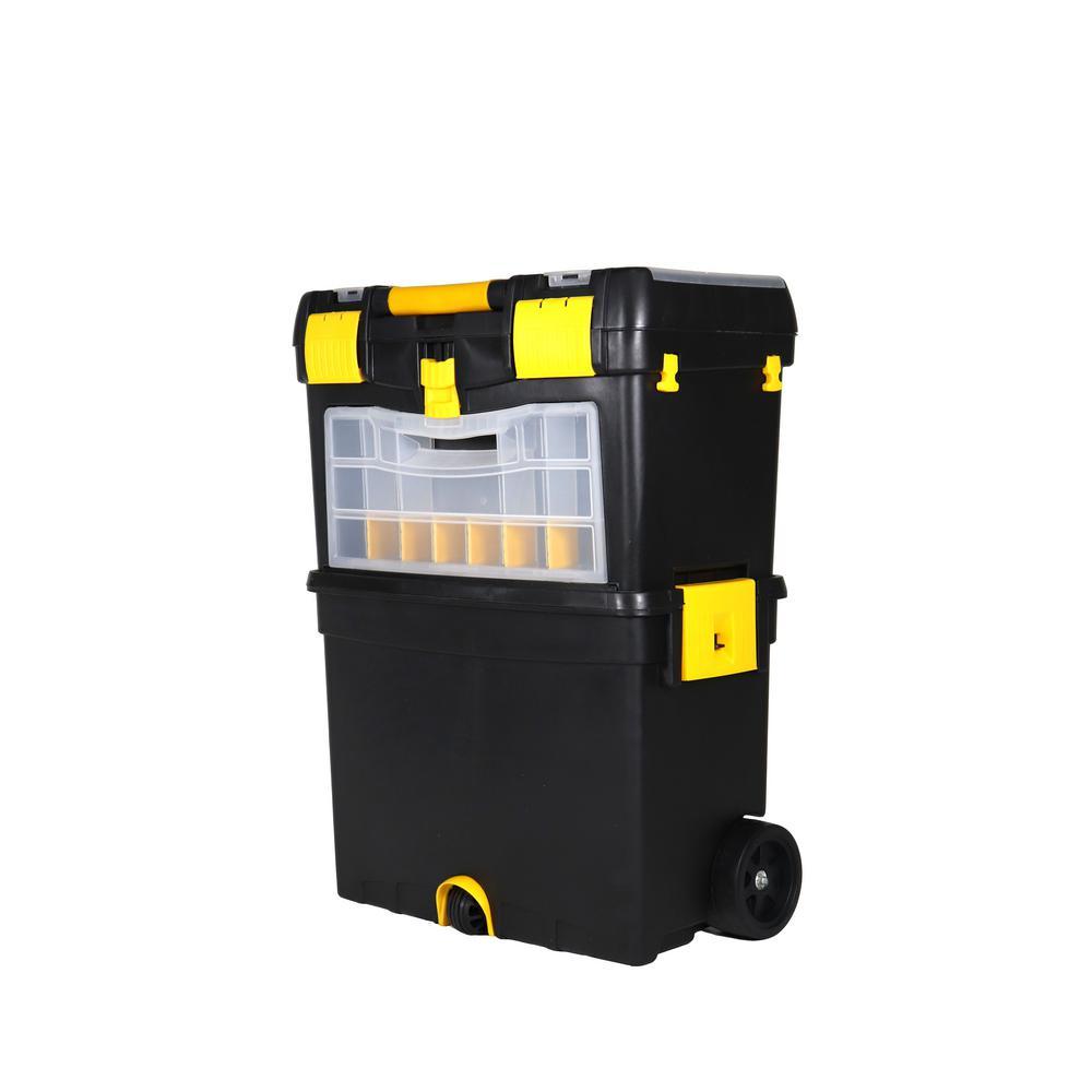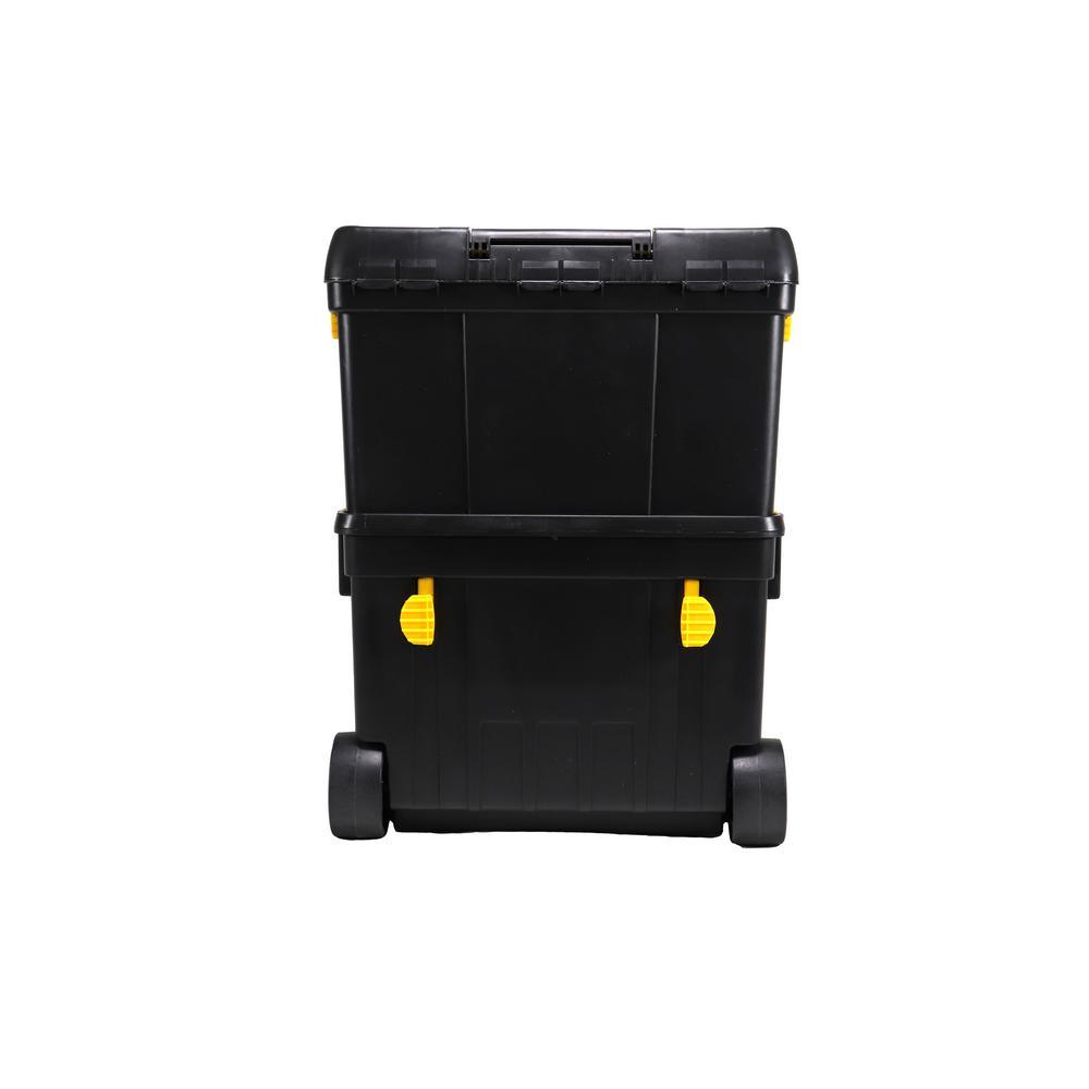 The Erie Tools 2-Tiered Rolling Toolbox keeps your tools organized and easily accessible while on the go. Made of durable polypropylene to keep your tools and accessories safe and secure on the toughest job sites. 2 yellow polypropylene side latches secure the top and bottom toolboxes together (4-1/8 in. x 3-1/4 in.). The Top Tier Toolbox features a comfort grip, foldable handle with 5-3/4 in. sliding lock latch. Equipped with a detachable clear polypropylene miscellaneous hardware organizer carrying case with 14 sections, embedded in the front face of the Top Tier Toolbox that can be used for storing nuts, bolts, screws, washers, nails, anchors and other pieces of small hardware. The Bottom Tier Toolbox features a removable tool tray and 2 yellow polypropylene hooks (on the back side) spaced apart at 12-1/4 in. that are used for hanging a coiled extension cord. Features drill bit storage molded into the tool tray. Stores up to 8 Bits and is divided into 2 sections. Features 2 4-1/4 x 2 in. Black Polypropylene Back Wheels and 2 Hard Black Polypropylene Ball-Shaped Front Wheel with Yellow Propylene Protective Hood.