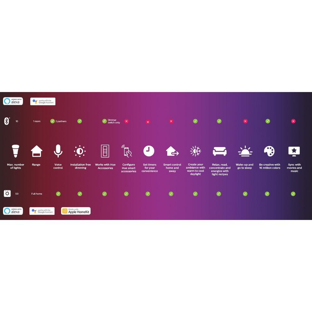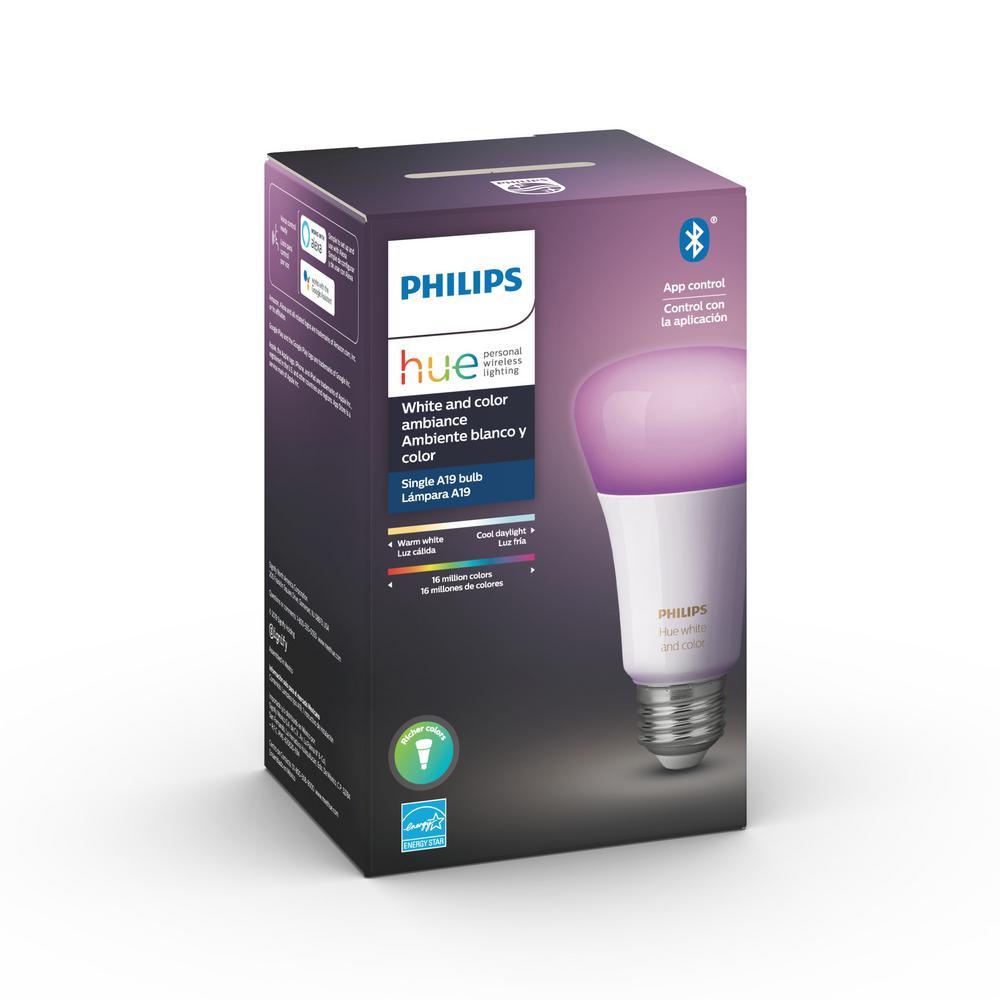 Easy smart lighting with Philips Hue. Add color to any room with a single smart bulb. Use Bluetooth for instant light control in one room or connect to the Hue Bridge (sold separately) to unlock the full set of smart lighting features. With the Hue Bluetooth app, you can directly control your Hue smart lights in a single room of your home. Add up to 10 smart lights and control them all with just the touch of a button on your mobile device. Get hands-free control of your lights and use your voice instead! Simple voice commands allow you to control multiple lights in a room or just a single lamp. Works with the Google Assistant and Amazon Alexa. Easy 2-step installation. Just screw in your Hue Bluetooth bulb and download the Hue Bluetooth app to connect directly to your new bulb. Transform your home with over 16 million colors, instantly creating the right atmosphere for any event. With the touch of a button, you can set a festive mood for a party, turn your living room into a movie theater, enhance your home decor with color accents, and much more. Add a Hue Bridge (sold separately) to your smart lights to experience the full set of features. With a Hue Bridge (sold separately), you can add up to 50 smart lights to control throughout your home. Create timers and routines to automate your entire smart home lighting setup, use your lights to wake up and go to sleep, control your lights while away from home or add accessories such as motion sensors and smart switches.