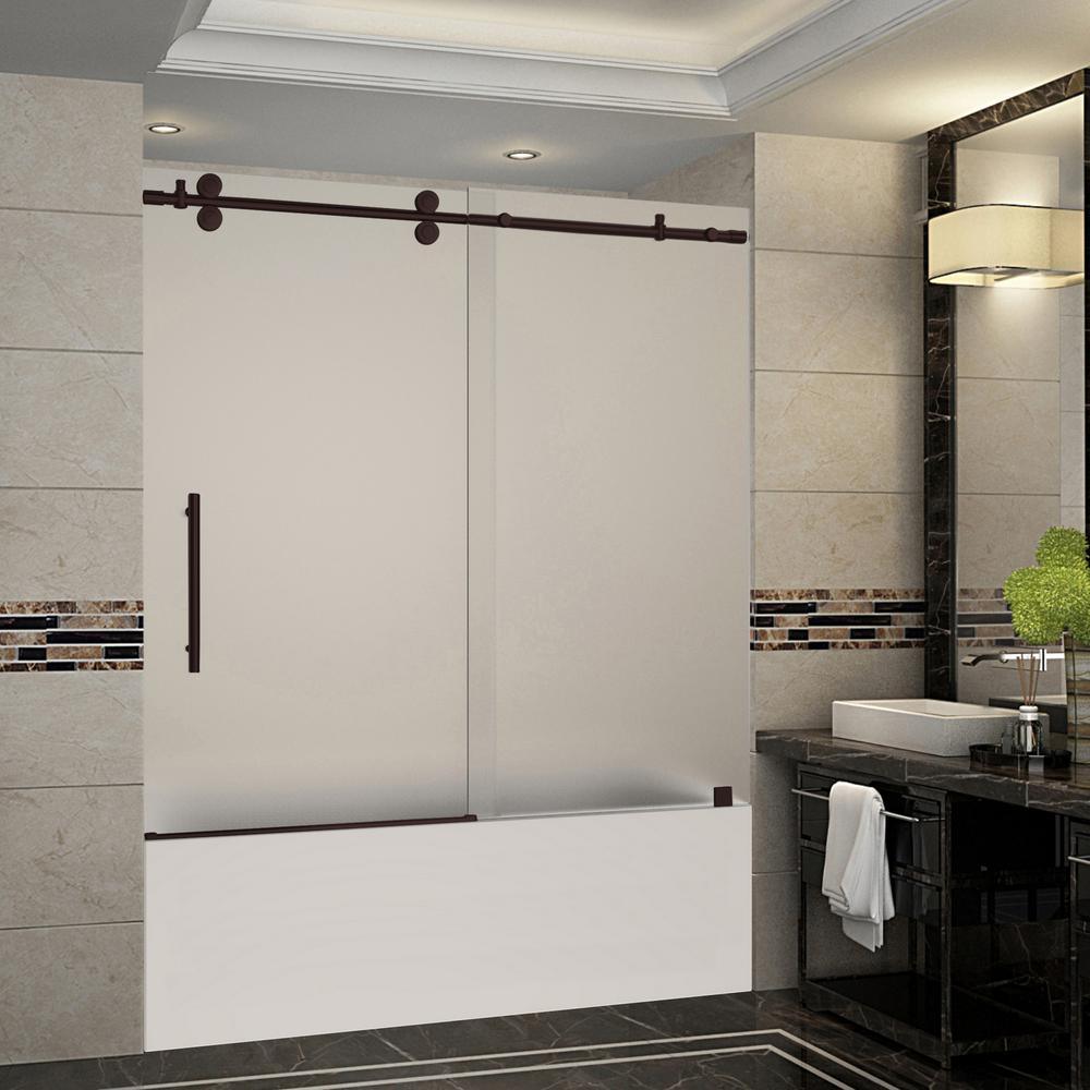 Instantly transform your current bathtub alcove with its old door or curtain with the Langham 60 in. completely frameless sliding tub-height shower door. This luxury fixture is designed with equal parts beauty and functionality. With its smooth, effortless sliding function, this door comes complete with premium frosted 3/8 in. thick tempered safety glass, tested and certified to ANSI Z97.1 Standard, a multitude of hardware finish options and deluxe clear leak-seal strips. This door is engineered for reversible instillation (right or left). Instantly upgrade your bath today with this gorgeous door.