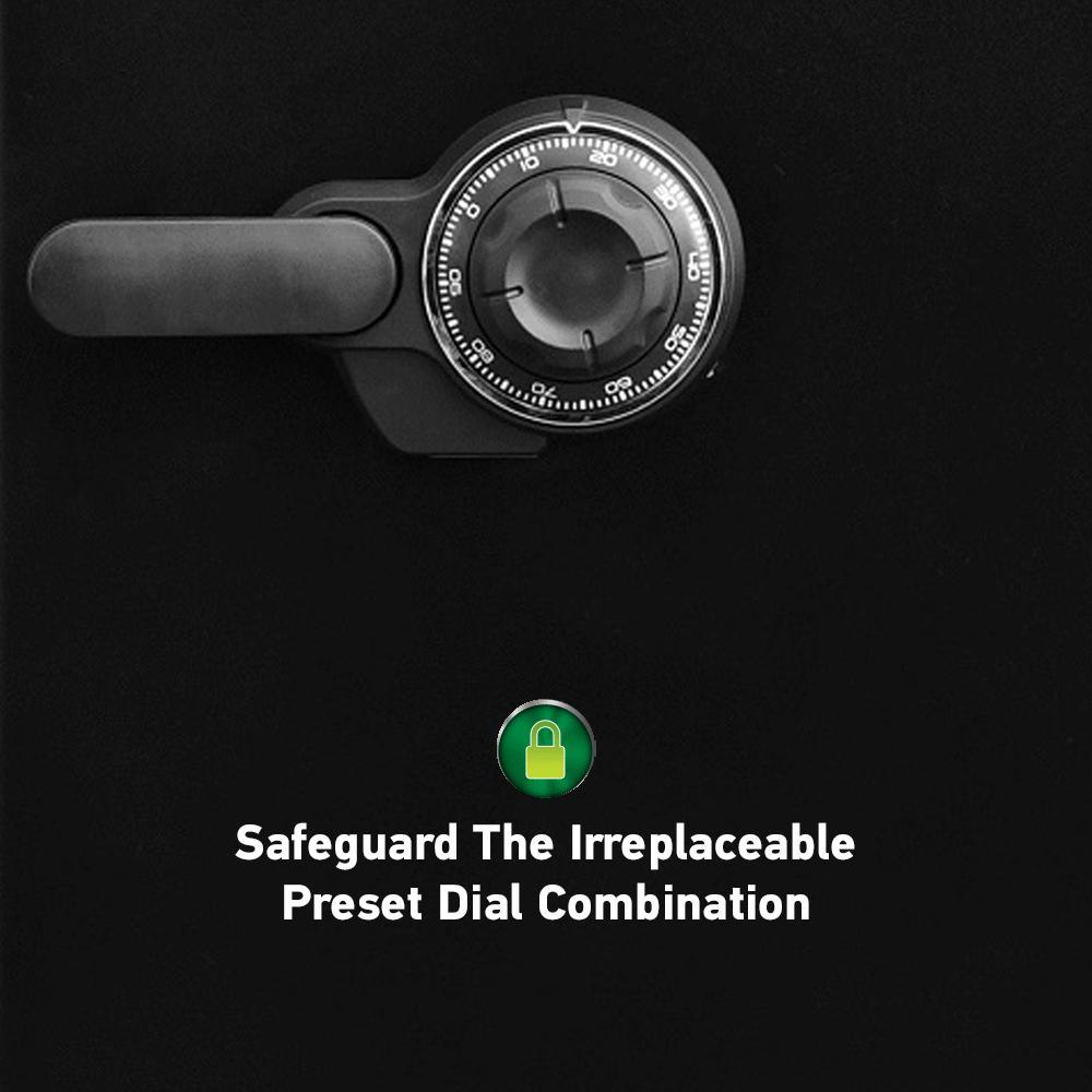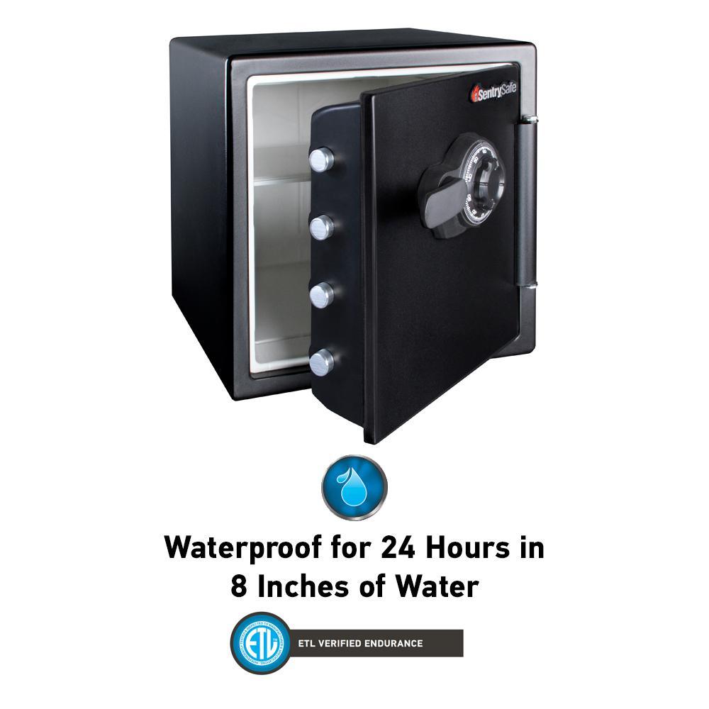 • Waterproof safe is ETL Verified for 24 hours of protection in water up to 8 inches deep offering peace of mind in the event of a flood 3. Preset dial combination fire safe for strong security; combination safe features four live-locking bolts, steel construction, pry-resistant hinge bar, and shelf