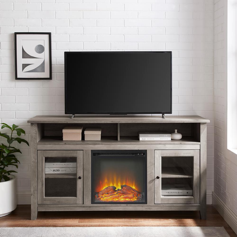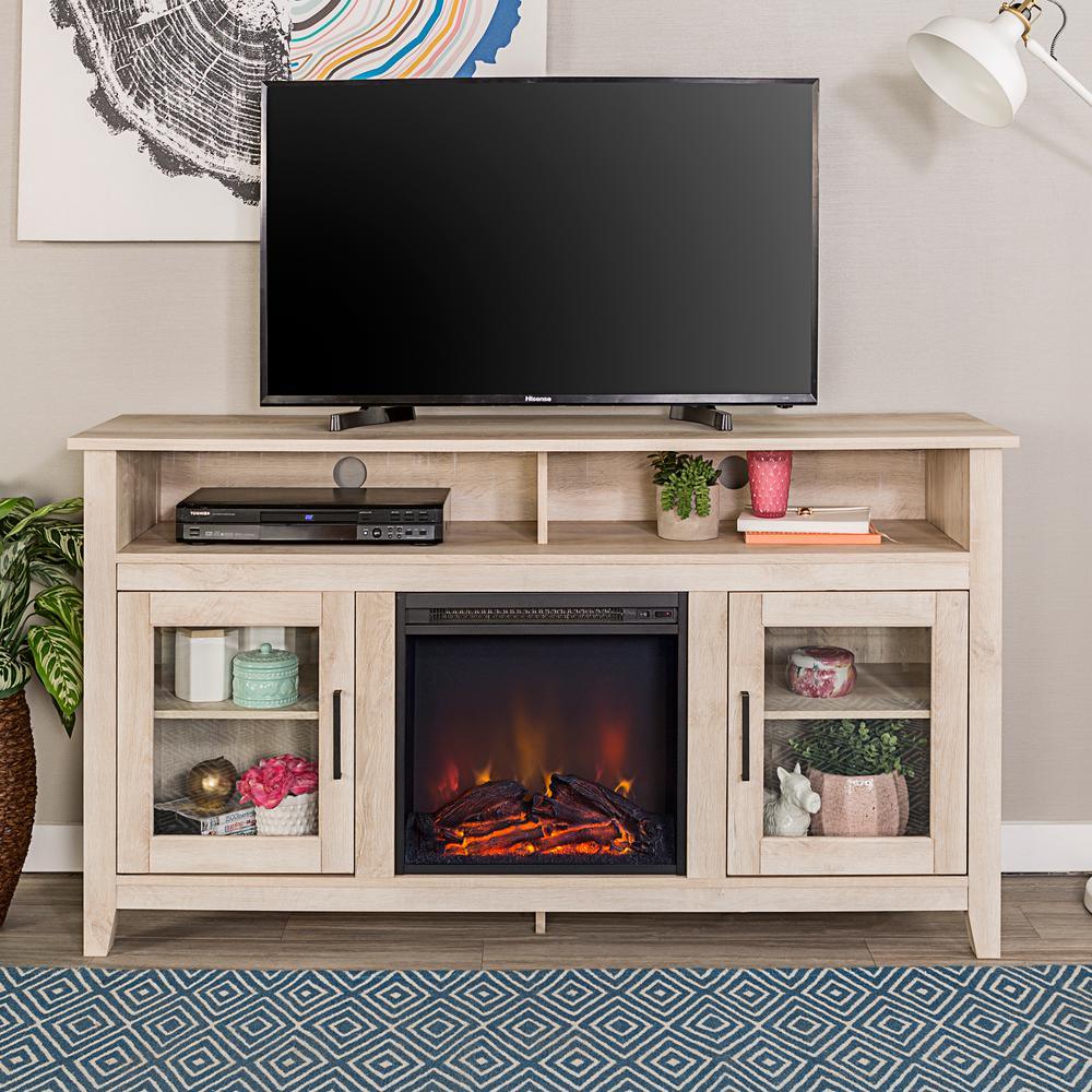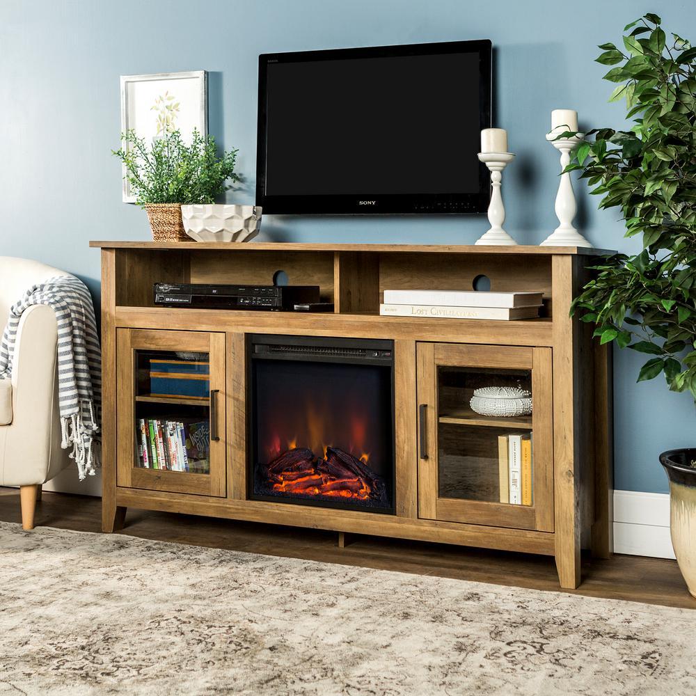 Create a cozy atmosphere with this 58 in. highboy media stand with an electric fireplace. This entertainment console is made of high-grade MDF, a warp free wood composite and finished with a premium multi-grain laminate ideal for everyday use. This stand accommodates TVs up to 64 in. It also features adjustable shelving behind 2 glass doors, open storage that fits your media components and accessories and a cable management system to maintain a tidy space. Install the electric fireplace by simply plugging it in to a standard outlet. No venting or electrician required.