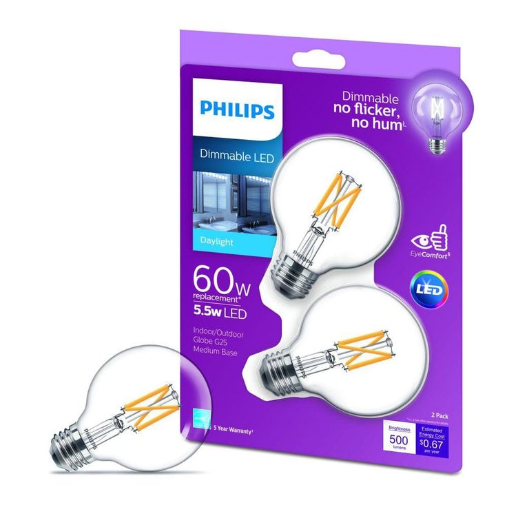 This 60-Watt equivalent G25 frosted globe LED bulb uses only 6-Watt of energy. Use as a replacement for your incandescent G25 bulbs in vanities, table lamps and other visible fixtures. The long lasting LED bulb is ideal for use in areas that are difficult to reach. The frosted appearance provides a bright, energizing light similar to natural daylight.