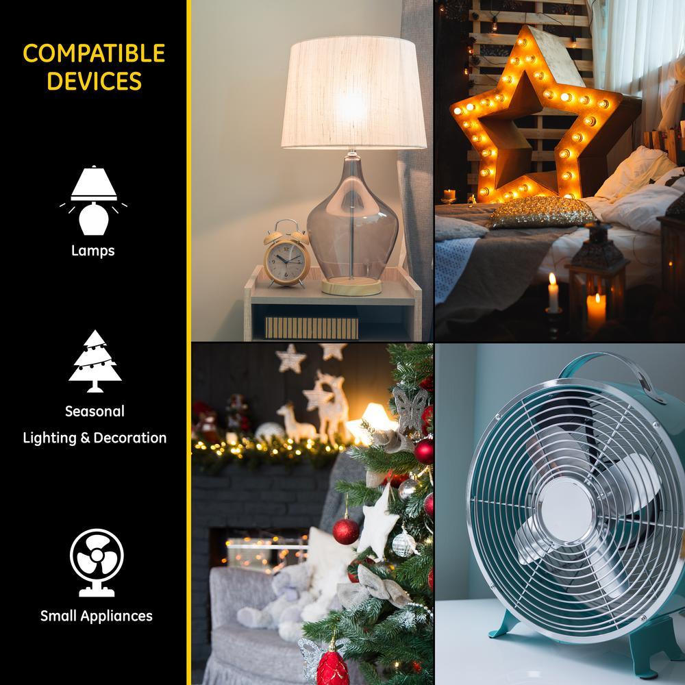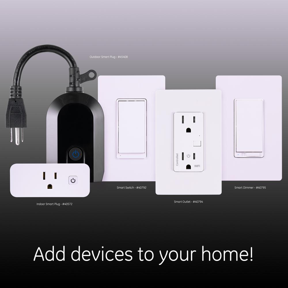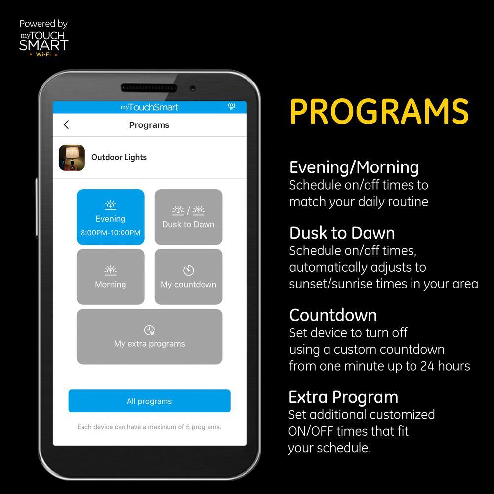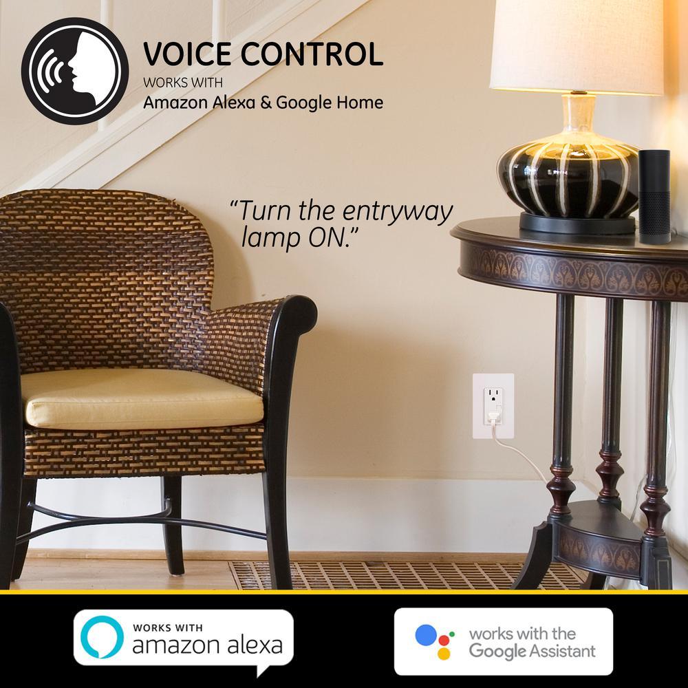 Take your lighting controls mobile with the GE-branded In-Wall Wi-Fi Smart Receptacle powered by myTouchSmart. Operated by the user-friendly myTouchSmart app - available on the Apple App Store and Google Play - the smart outlet connects to a 2.4GHz Wi-Fi network for control anywhere. Enjoy the hands-free convenience of voice commands through direct compatibility with Amazon Alexa and Google Assistant without a hub. The Wi-Fi receptacle features one Wi-Fi-controlled outlet as well as an always-on outlet. The myTouchSmart app offers one-touch presets, custom my on/my off times and a full-range countdown to accommodate even the most varied schedules. Built-in SunSmart technology automatically recognizes the sunrise and sunset times for your region and adjusts programs accordingly. Complete control of plug-in LED, CFL, incandescent and halogen lights as well as fans and more has never been easier. Make yourself at home everywhere with the GE-branded In-Wall Wi-Fi Smart Receptacle powered by myTouchSmart.