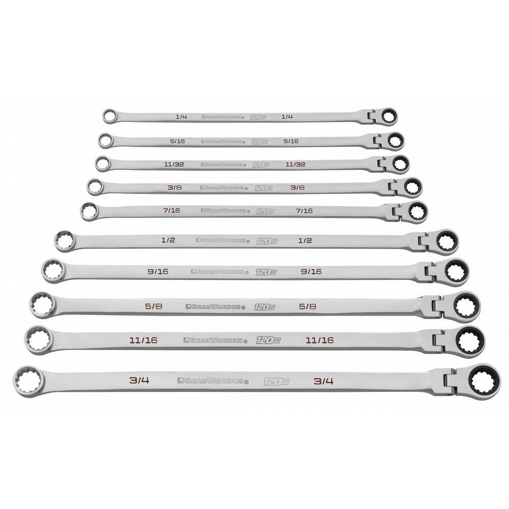 The GearWrench 120XP Flex-Head Gearbox ratcheting wrenches offer the longest reach of any GearWrench ratcheting wrench. The combination of the 120 position ratcheting wrench mechanism with 3 swing arc, the flex-head and XL beam length give the best access and leverage available. Universal spline drive works on 5 different common fasteners, 12 point and 6 point, rounded 6 point, spline, E-Torx and square. Non ratcheting end for breaking free fasteners and 0 offset to increase access.