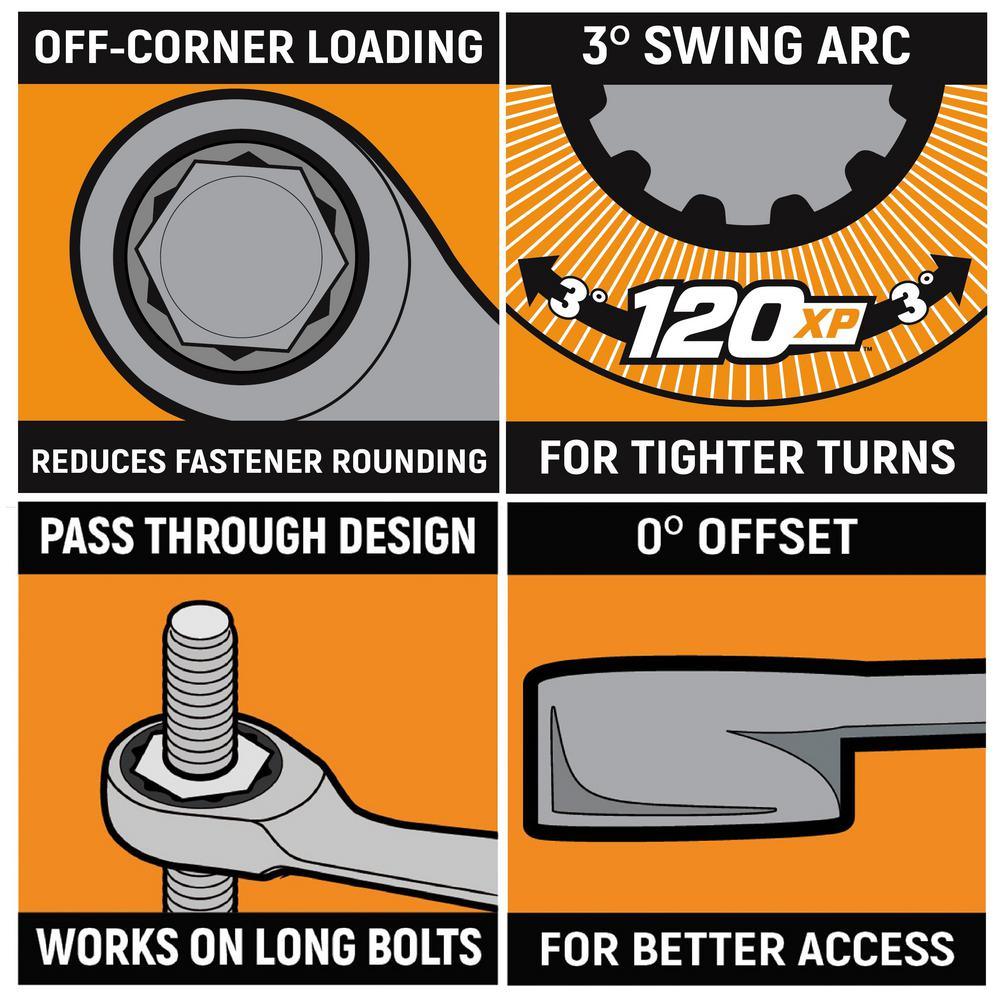 120XP ratcheting box ends have 120 positions providing a 3 swing arc so you can turn fasteners in tighter confines