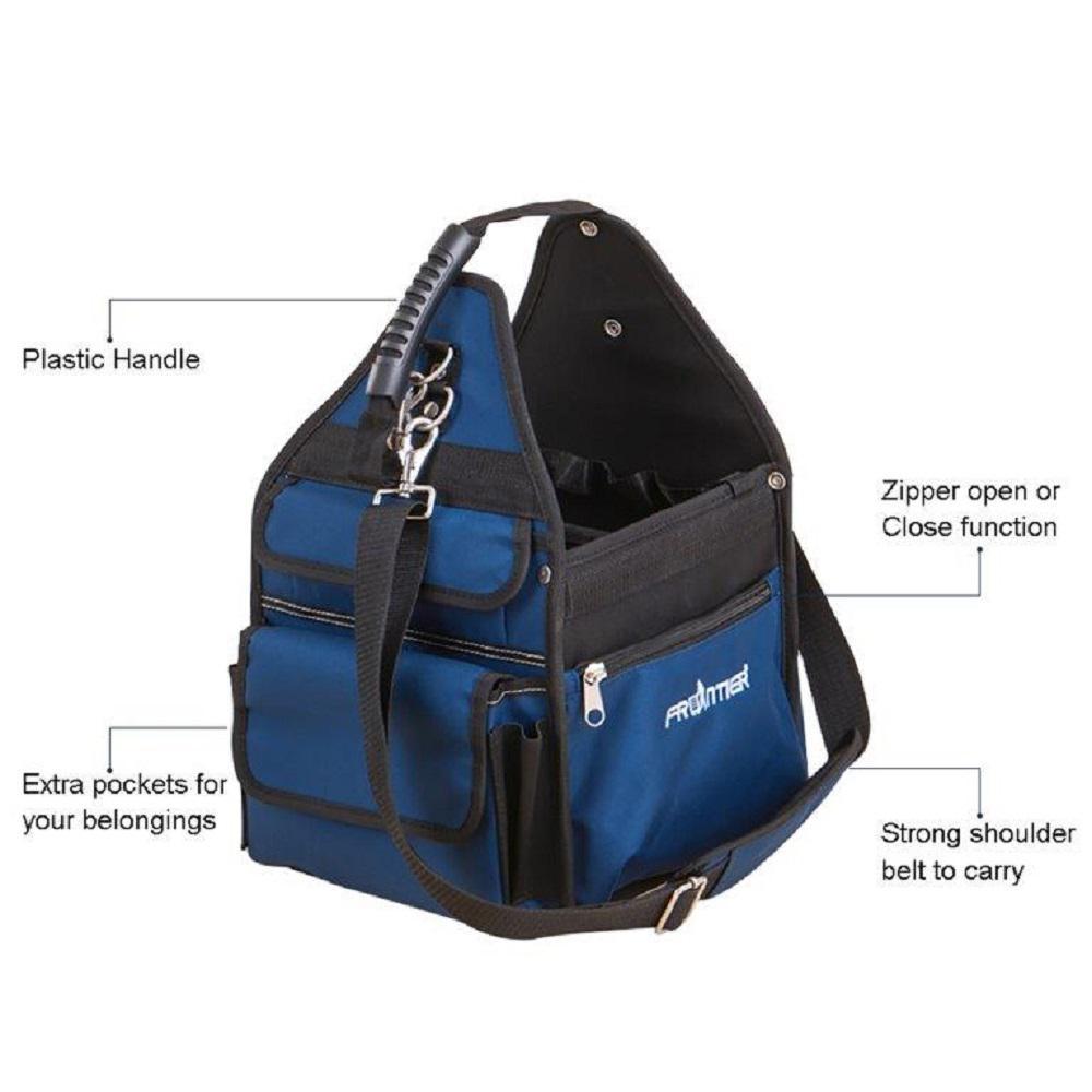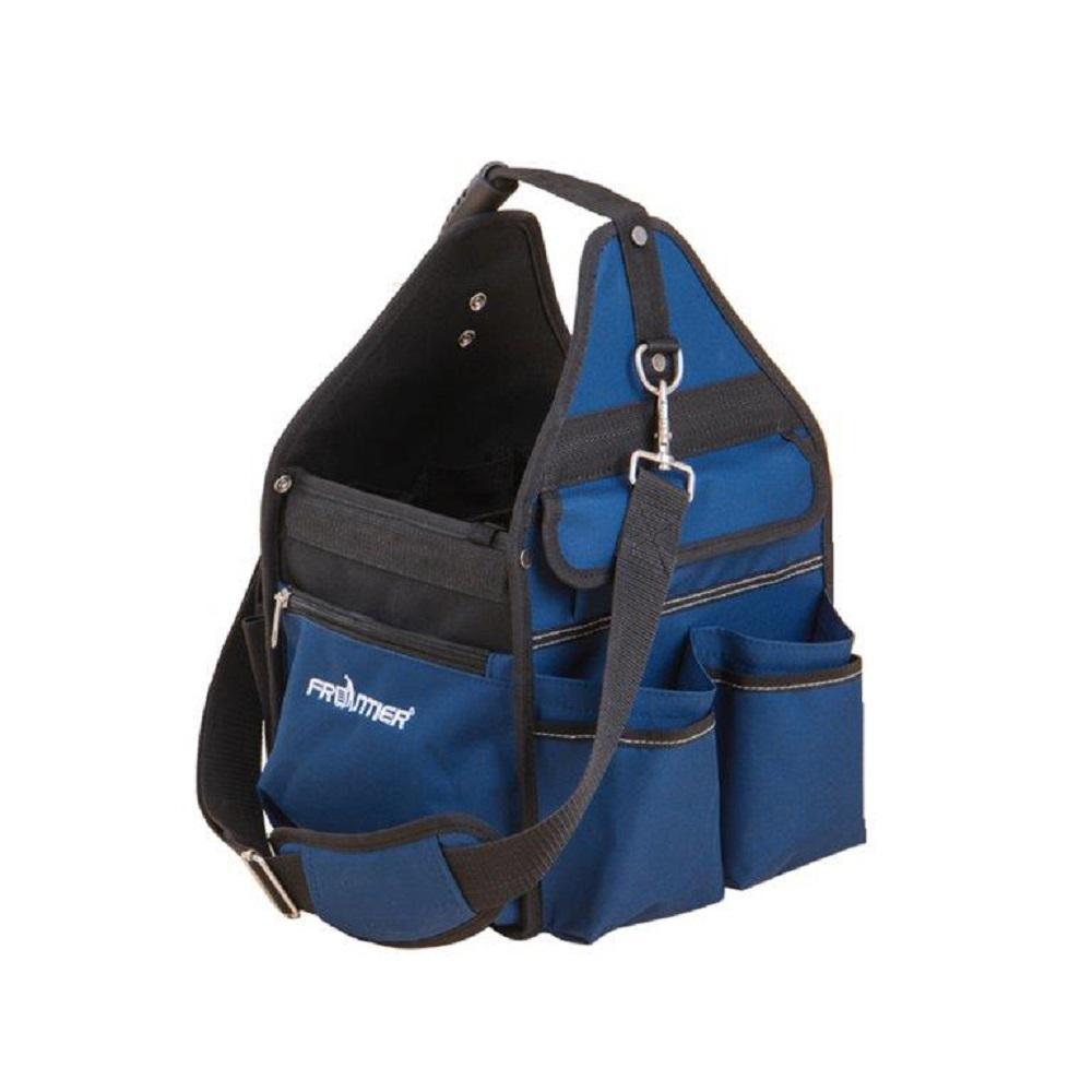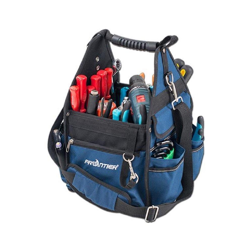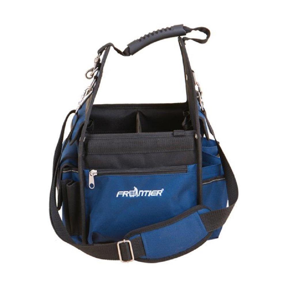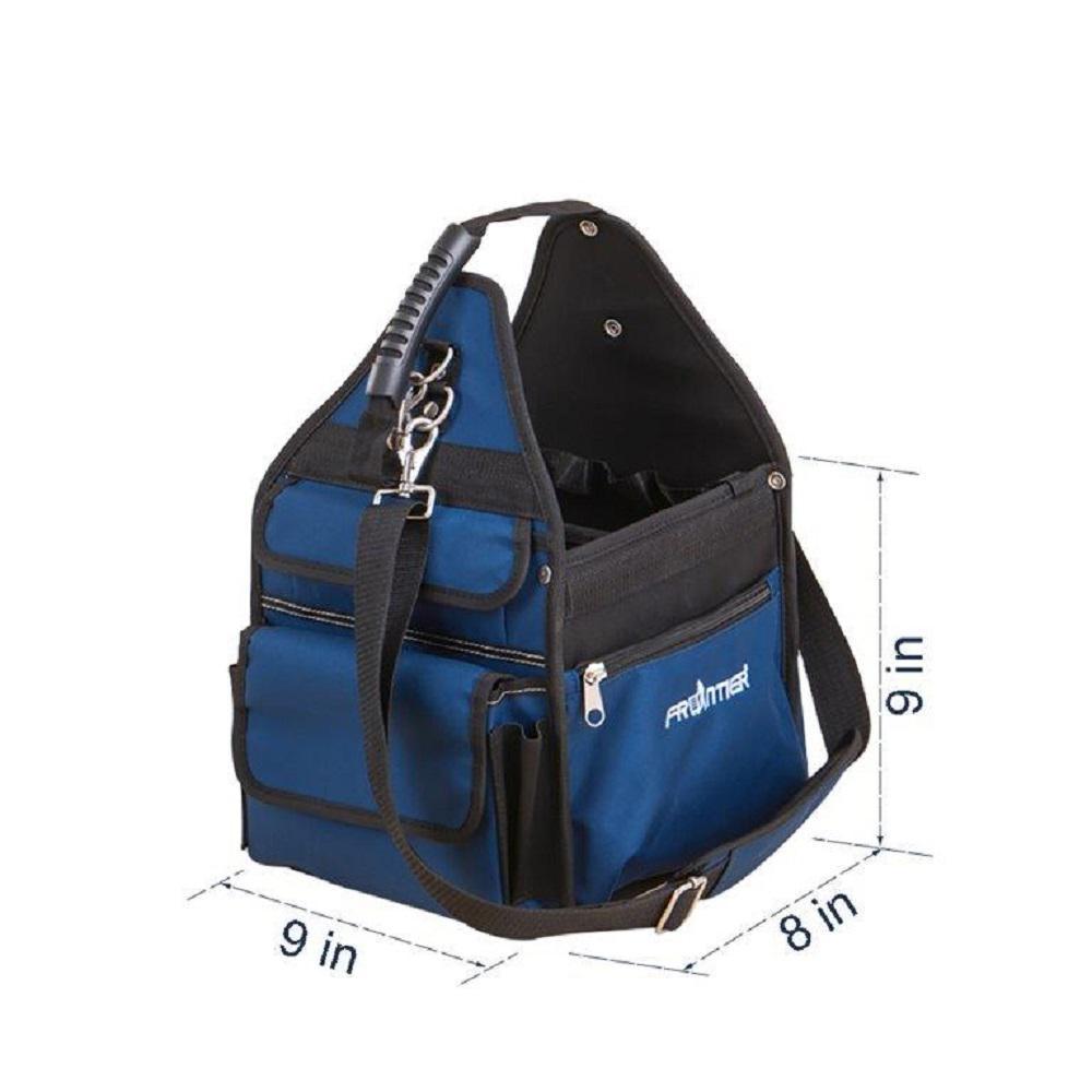 This Frontier heavy-duty 600 Denier double wall polyester tool bag is built to last. It has an open top design, rubber handle and 9 exterior pockets. Features of this bag include: removable padded shoulder strap, easy access to pockets removable inner divider and electrical tape holder. Dimensions: 9 in. W x 10 in. D x 9 in. H.