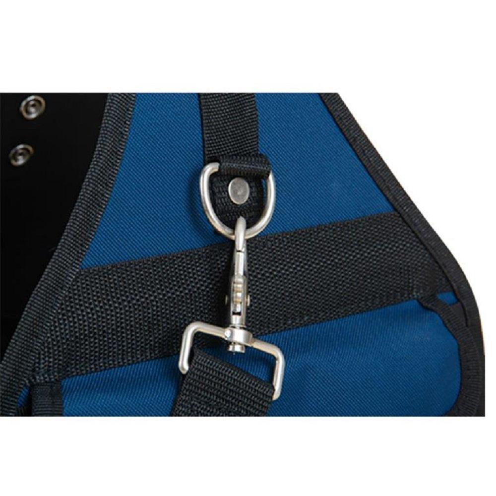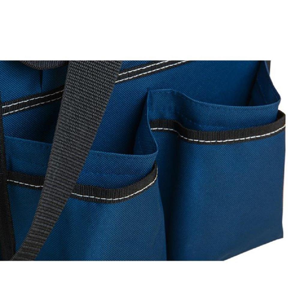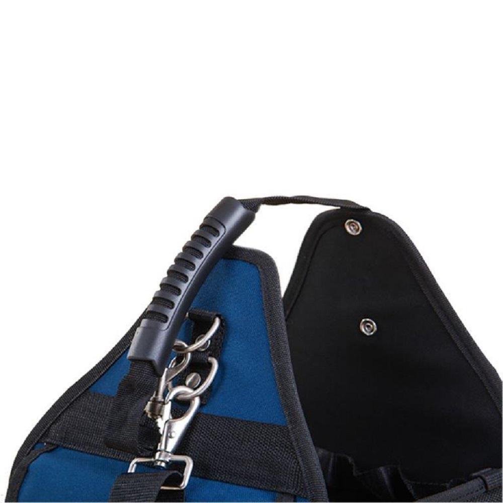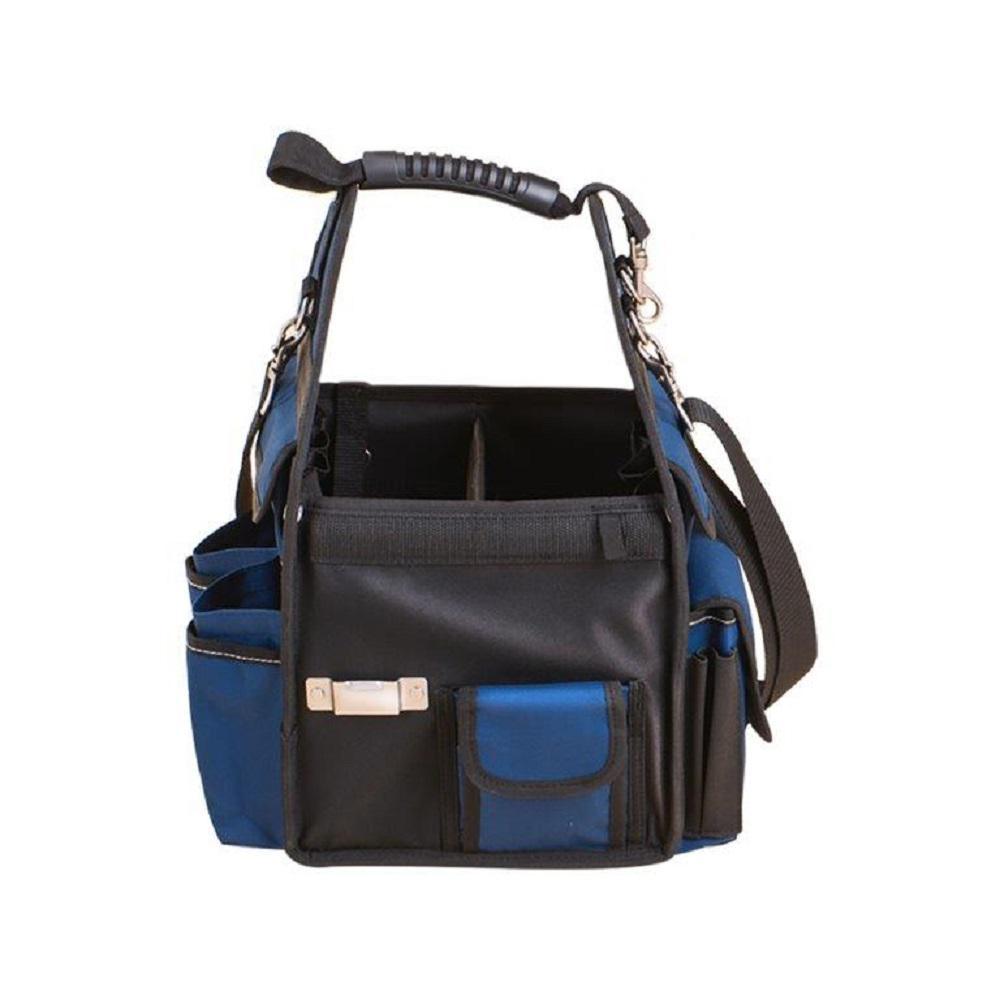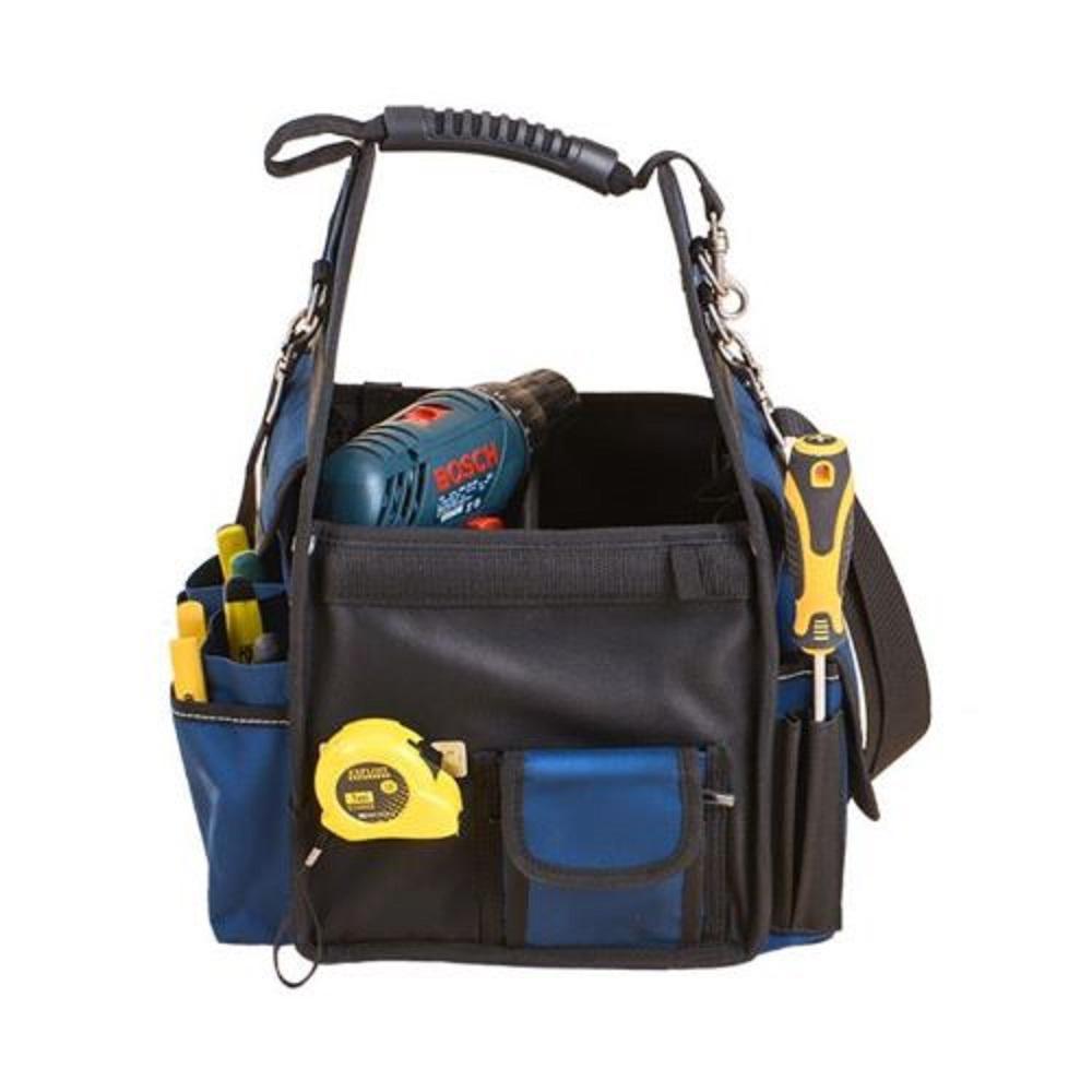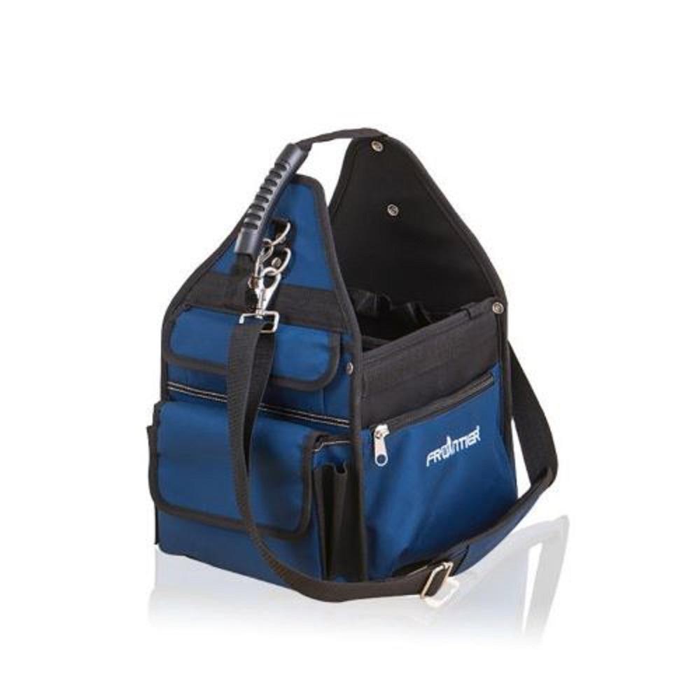 This Frontier heavy-duty 600 Denier double wall polyester tool bag is built to last. It has an open top design, rubber handle and 9 exterior pockets. Features of this bag include: removable padded shoulder strap, easy access to pockets removable inner divider and electrical tape holder. Dimensions: 9 in. W x 10 in. D x 9 in. H.