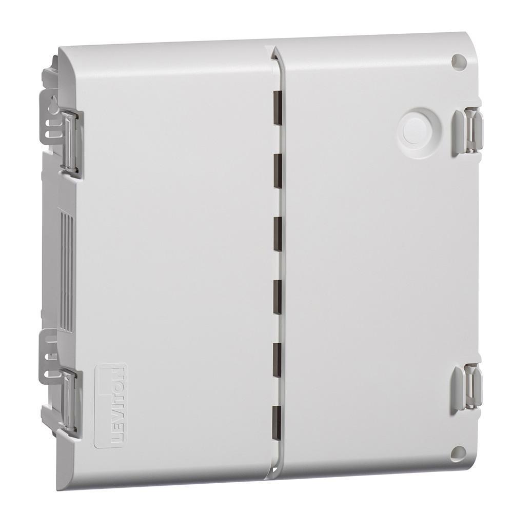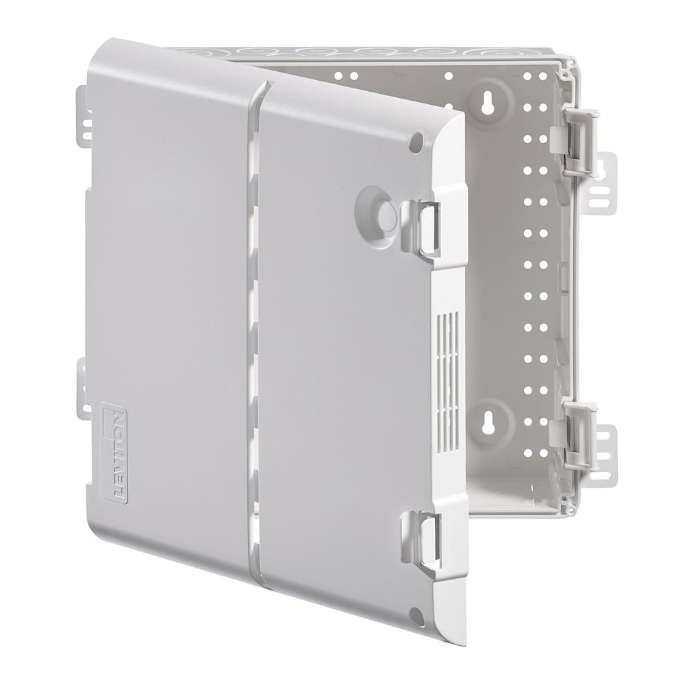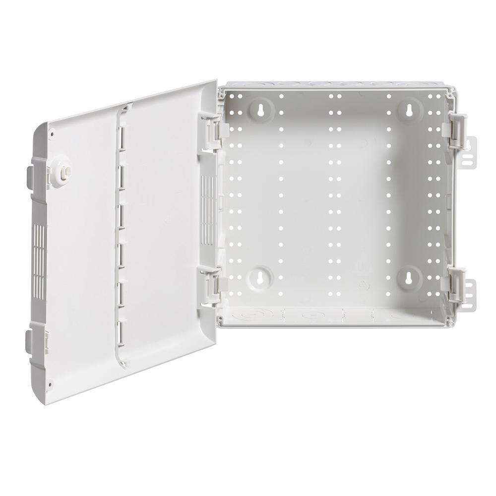 Maximize the signal range and reliability of a wireless home network by housing its structured wiring components in Leviton's line for Wireless Structured Media Centers, offered in (14 in. x 13.7 in.), (28 in. x 13.7 in.), and (42 in. x 13.7 in.) sizes. Unlike standard metal enclosures that inhibit signal range, this ABS polymer enclosure offers RF transparency to minimize interference. The enclosure (49605-14P) is 14 in. H and includes a vented, 180° hinged door that facilitates cooling of enclosed equipment. The door installs tool-free with innovative ratcheting hinges that can be adjusted to accommodate differing drywall sizes, and imperfections. The door may be installed left, or right hand swinging. With the additional of a door lock kit (5L000-L0K), the enclosure can be securely locked. With seven 1 in. knockout, and three 2 in. knockouts, the enclosure makes installation, maintenance, and expansion quick and easy. Features: Flame-retardant ABS polymer minimizes interference. Enhanced Tri-Plane vented door assists in airflow for cooling active gear. Compatible with all Leviton Structured Media components. Contents: Wireless (RF Transparent) Structured Media Center Enclosure, Vented Hinged Door. Note: Required screws not included.