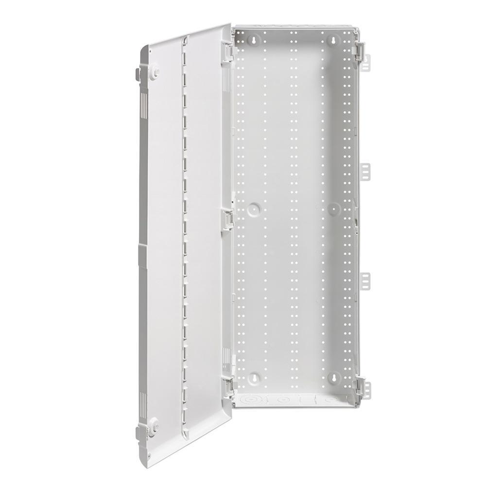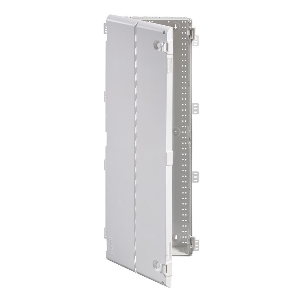 Maximize the signal range and reliability of a wireless home network by housing its structured wiring components in Leviton's line for Wireless Structured Media Centers, offered in (14 in. x 13.7 in.), (28 in. x 13.7 in.), and (42 in. x 13.7 in.) sizes. Unlike standard metal enclosures that inhibit signal range, this ABS polymer enclosure offers RF transparency to minimize interference. The enclosure (49605-42P) is 42 in. H and includes a vented, 180° hinged door that facilitates cooling of enclosed equipment. The door installs tool-free with innovative ratcheting hinges that can be adjusted to accommodate differing drywall sizes, and imperfections. The door may be installed left, or right hand swinging. With the additional of a door lock kit (5L000-L0K), the enclosure can be securely locked. With seven 1 in. knockout, and three 2 in. knockouts, the enclosure makes installation, maintenance, and expansion quick and easy. Features: Flame-retardant ABS polymer minimizes interference. Enhanced Tri-Plane vented door assists in airflow for cooling active gear. Compatible with all Leviton Structured Media components. Contents: Wireless (RF Transparent) Structured Media Center Enclosure, Vented Hinged Door. Note: Required screws not included.