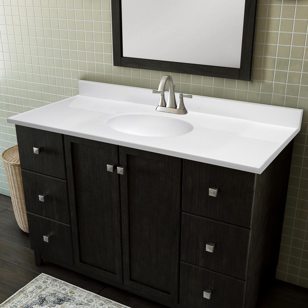 Give your bathroom that clean, classic look youve been searching for with the Design House 49 in. Cultured Marble Vanity Top with solid white finish. This spacious top features a drip free edge to help contain excess water and squared edges that evoke a more modern look. Three pre-drilled holes make installing a 4 in. centerset faucet easy and an integrated backsplash creates a barrier between your wall and the vanity to help prevent mold and water damage. The oval bowl at the heart of this top is integrated directly into the design for a seamless look. The Cultured Marble Vanity Top comes with a 5-year limited warranty that protects against defects in materials and workmanship.