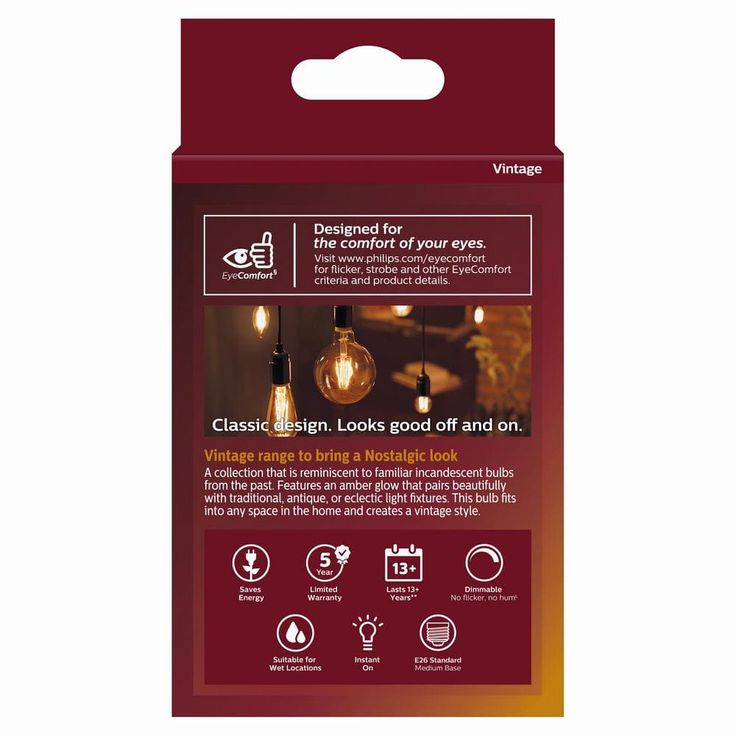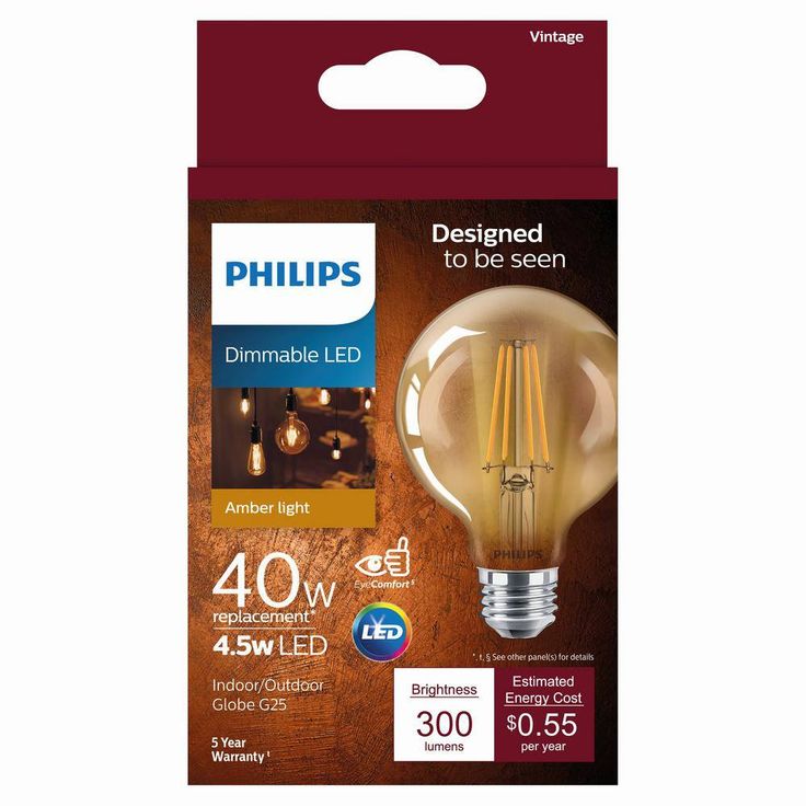 Introducing the new Philips Vintage LED light bulb family, a collection that is reminiscent of familiar incandescent bulbs from the recent past. Available in an array of giant shapes, candles and other familiar form factors, they provide a seamless fit across your space collectively. This 40-Watt equivalent glass bulb stands out when used as a statement piece, adding a sense of nostalgia to your interiors. The intricate LED filament emits a familiar orange amber glow all around through its crystal clear, fully dimmable glass bulb, perfect for mood setting and style creation inside and outside your home. With no visible flickering and an instant full level brightness when switched on, you will also enjoy soft and evenly distributed warm white light with that vintage charm of yesteryear across your spaces.