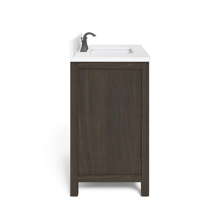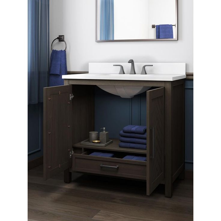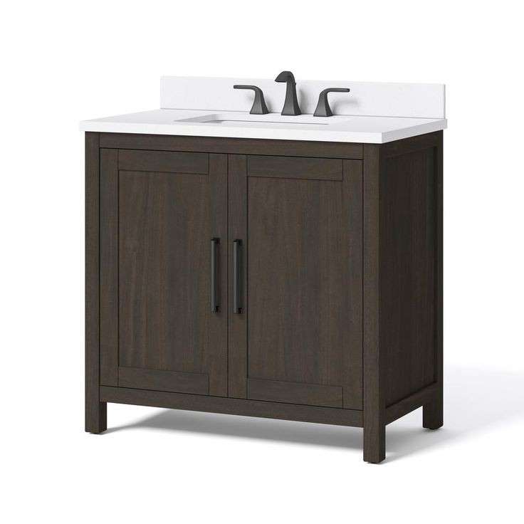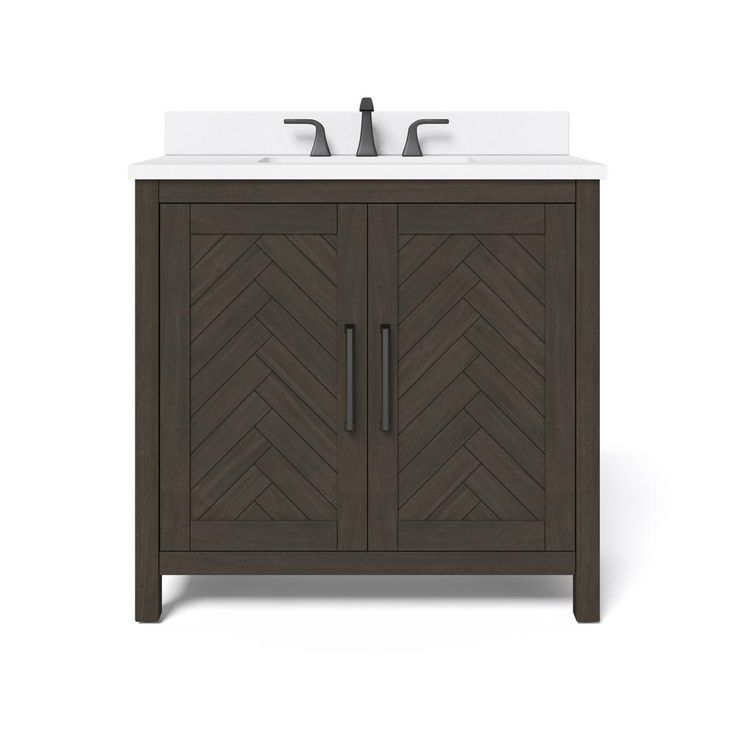 Create a fresh look for your bathroom with the Collection Name 36 in. vanity. The vanity has a rich espresso finish and is topped with a 36 in. x 20 in. engineered white stone top featuring an under-counter rectangular basin and 4 in. backsplash. The two chevron patterned cabinet doors are equipped with euro-style soft-close hinges and the cabinet has a concealed pullout drawer, ideal for towels and washcloths. Add enduring style to your bathroom with this Collection Name vanity.