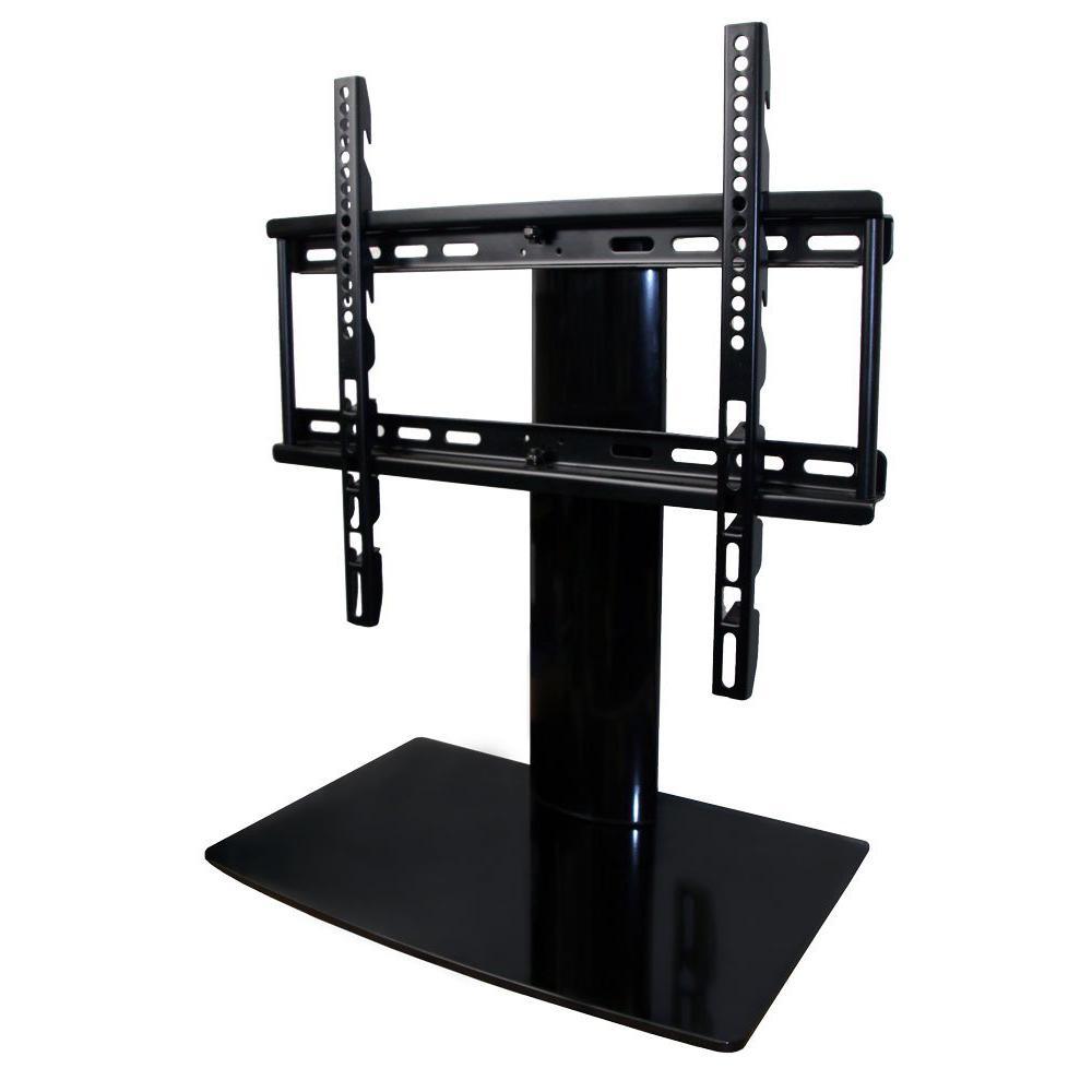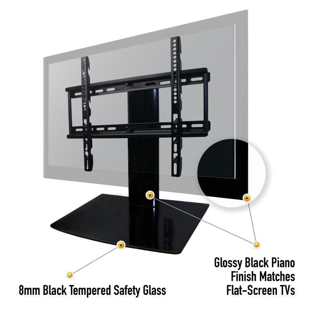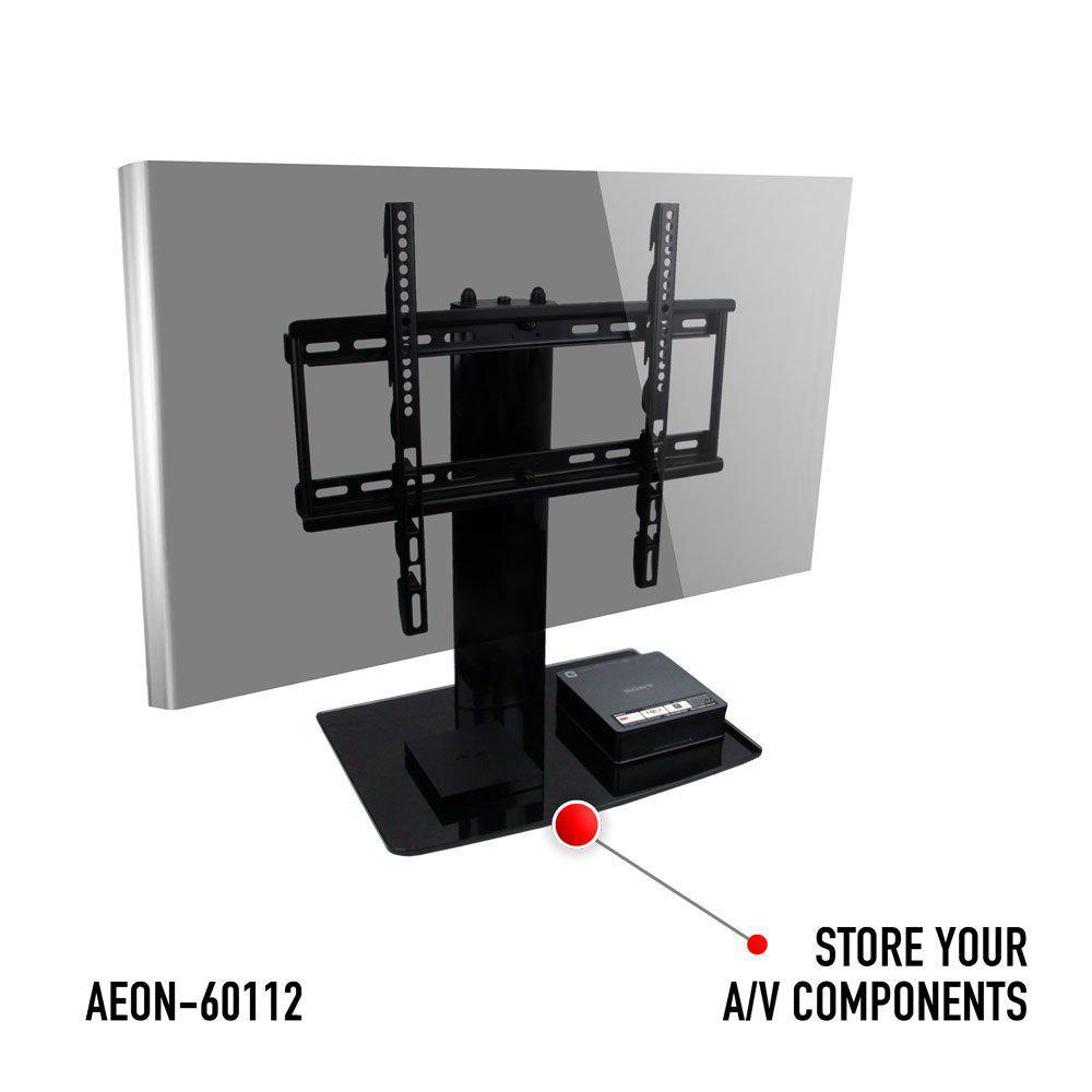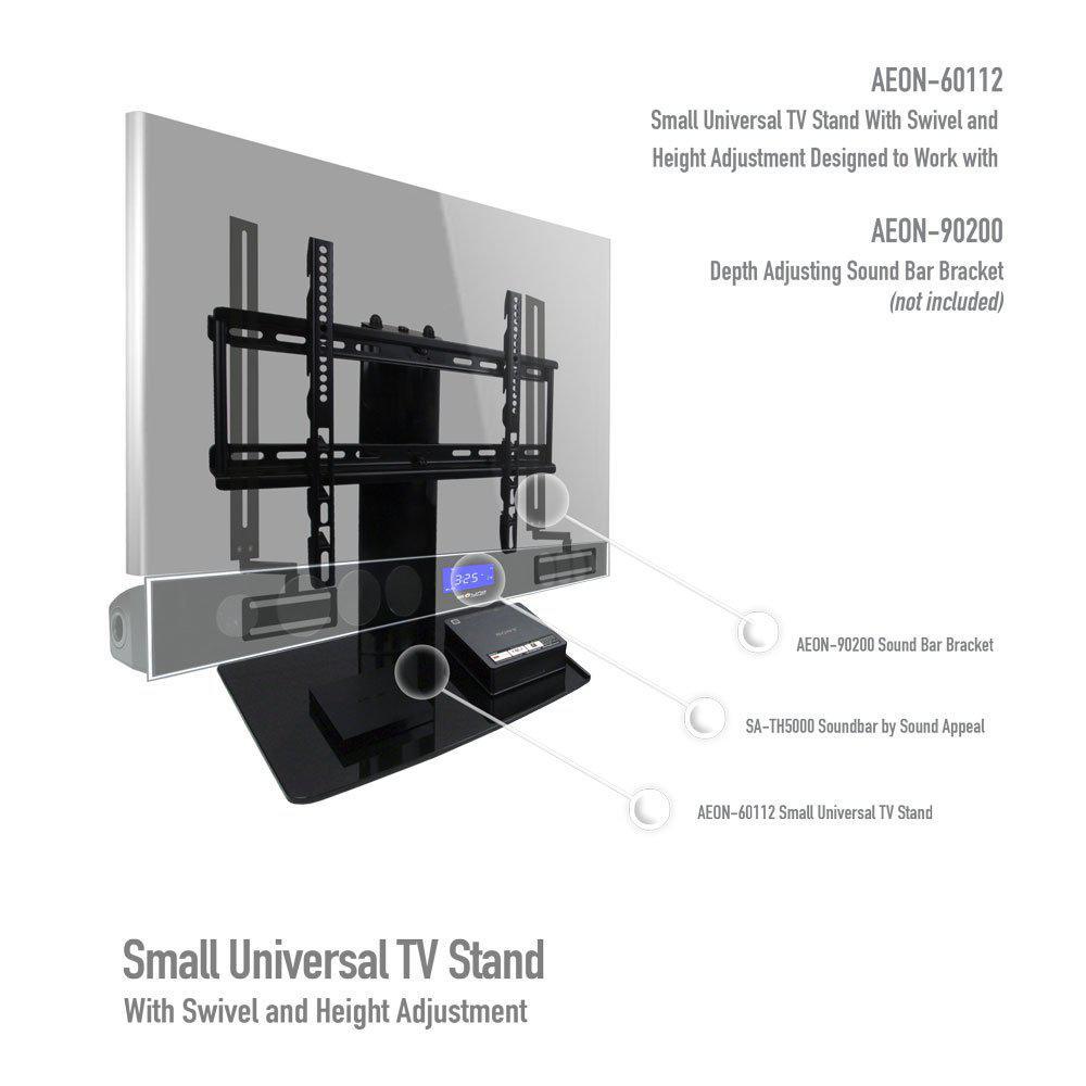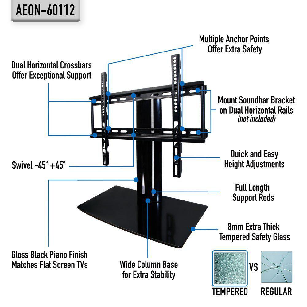 Sleek, modern design This replacement TV stand is great for smaller displays. The Aeon 60112 swiveling Universal TV stand is ideal for flat panel displays 23-50 in. Works great as a replacement TV stand for Samsung TV stand, Vizio TV stand, Sony TV stand and many others. All while making the most of functionality. The black 8 mm thick tempered safety glass base enhances the look and overall design. Intelligent TV stand This swiveling TV mount adds a unique ability to swivel where others cannot. Now your TV can be directed up to 45° in each direction towards the viewing area by pivoting the unit. No need to twist the base with it. This feature is usually available only on articulating TV mounts. Functional TV stand This TV stand mounts the TV high enough to have a Sound Bar or video game sensor in front and not block the view or the infrared sensor on the TV. Most TV stands have the TV too low to do this.