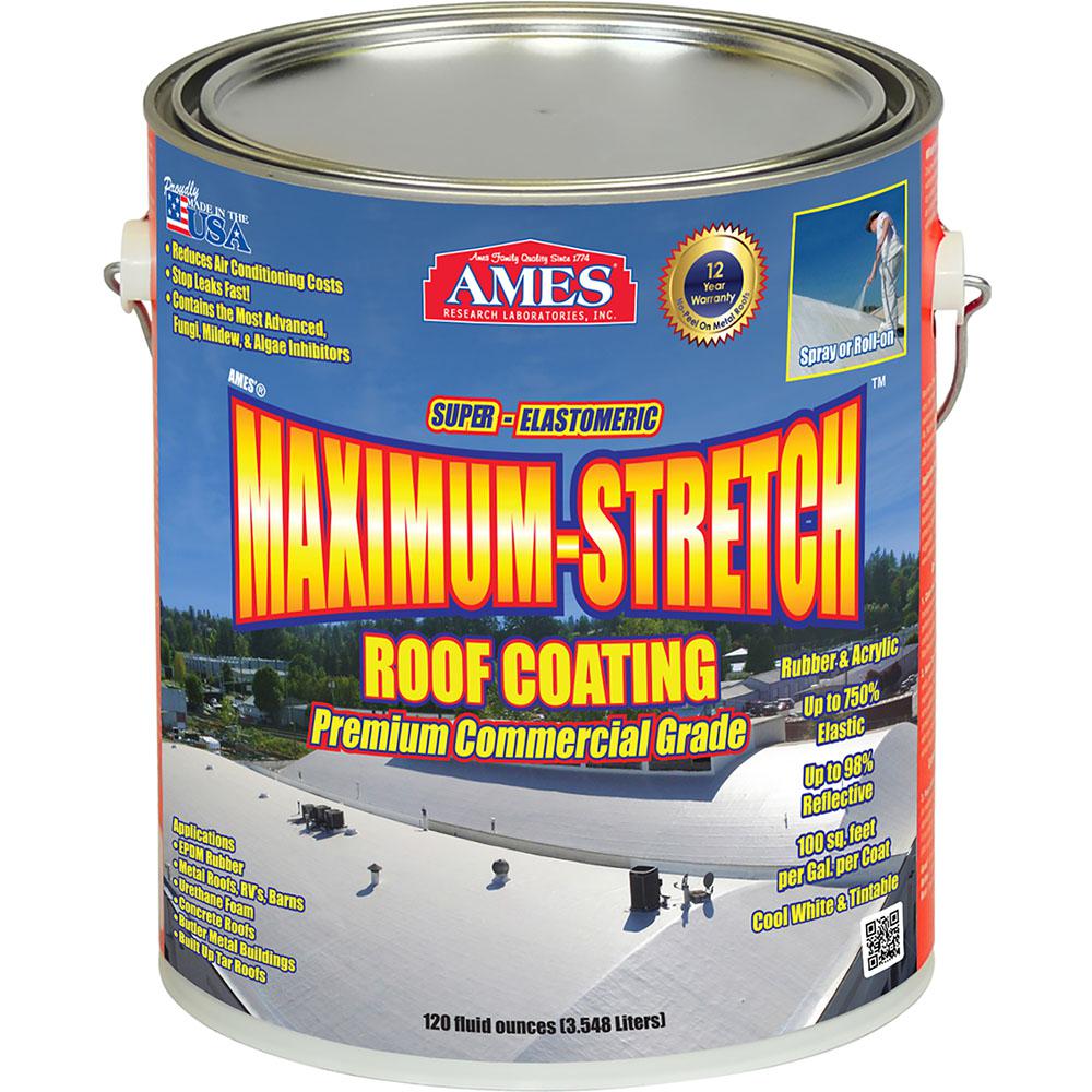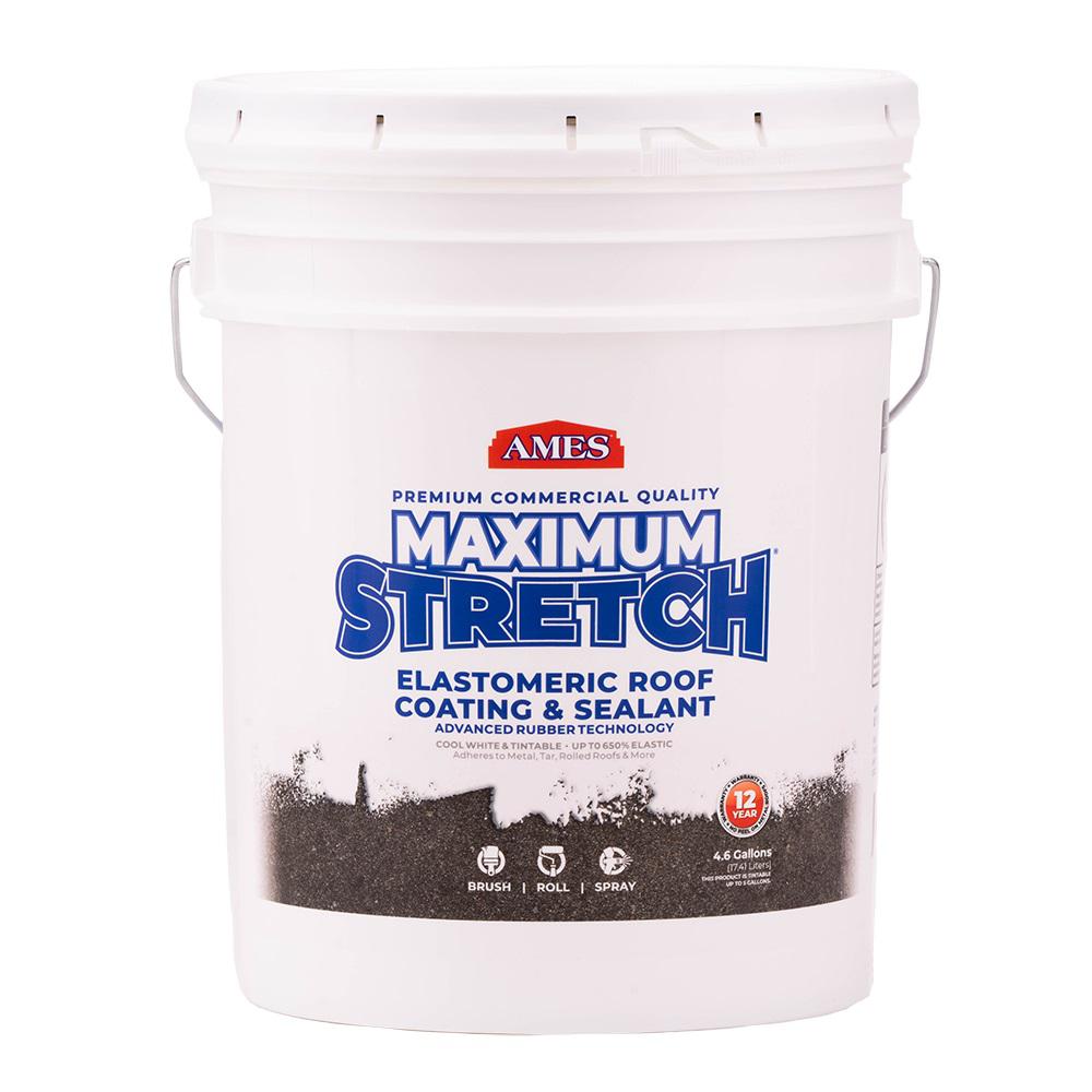 Ames Maximum-Stretch is a thick, high quality rubber and acrylic elastomeric coating designed specifically for waterproofing, repairing and maintaining many different types of roofs. It dries rapidly to form a cool white, watertight roof membrane that expands and contracts with the roof surface. It seals, saves and extends the life of old roofs and is an excellent choice for old tar roofs.