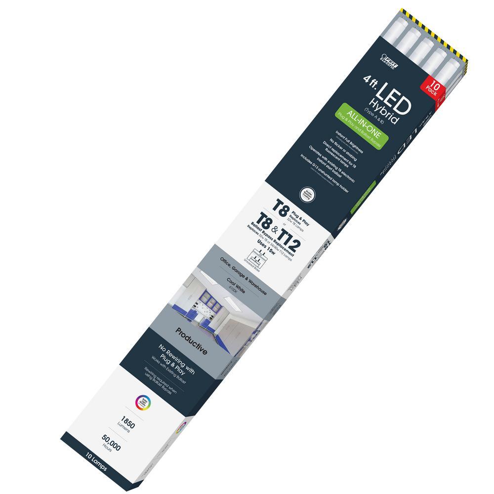 Convert your existing fluorescent fixture to LED technology with the Feit Electric 4 ft. T8 32-Watt or T12 40-Watt Fluorescent Replacement Hybrid Plug and Play/Ballast Bypass LED Lamps, a common replacement item for fixtures using fluorescent bulbs. These non-dimmable 4100K cool white lights produce a similar fluorescent light output (1850 Lumens) using only 15-Watt of electricity - up to 53% less energy. Get instant on to full brightness, with relatively cool running performance. Feit Electric shatterproof T8 / T12 bulbs have an average life of 50,000 hours / 45.66 years, are RoHS compliant and 100% mercury free. Choose dependable lighting for residential or commercial applications. These versatile bulbs can be used either as plug and play replacements using existing fixtures or can operate without a ballast with basic wiring of the fixture. Type A direct replacement LED lamp requires no rewiring, simply remove your fluorescent lamp and install the LED lamp - Plug and Play. Patented internal driver technology operates with most T8 Electronic ballast or T12 Magnetic and/or Electronic ballasts. Type B replacement LED lamp eliminates the need for ballasts, installation requires basic wiring of the fixture. Replace the old lumen depreciated light bulb with the new LED light bulb to maintain full brightness. Choose a dependable flicker-free bulb for residential or commercial applications.