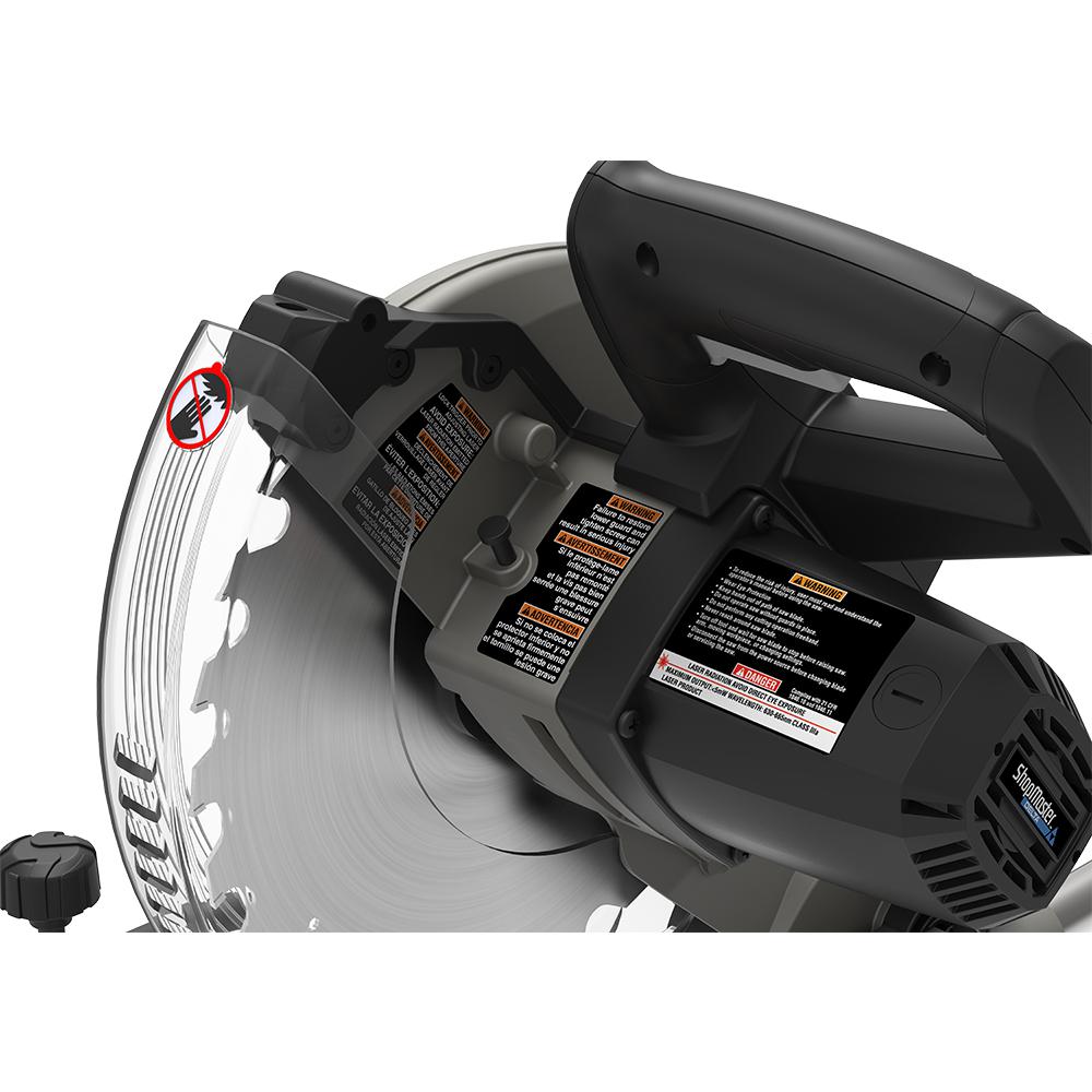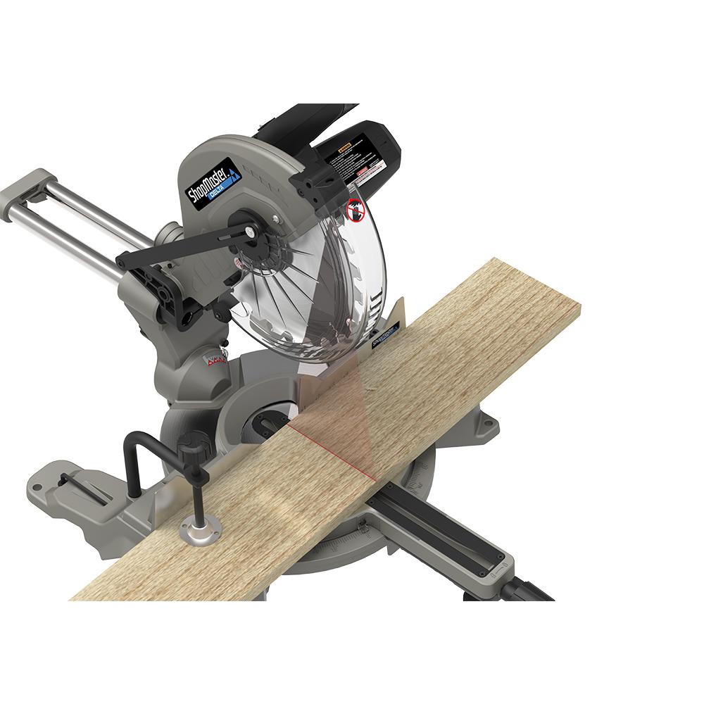 The Shopmaster brand is known for affordability and reliability. This Shopmaster 12 in. Slide Miter Saw is made by Delta Power Equipment and comes with a 3-Year Warranty. There is 1 sliding miter saw per package. The unit includes a dust collection bag and a work clamp. A built-in laser lets you know where the cut will be made.