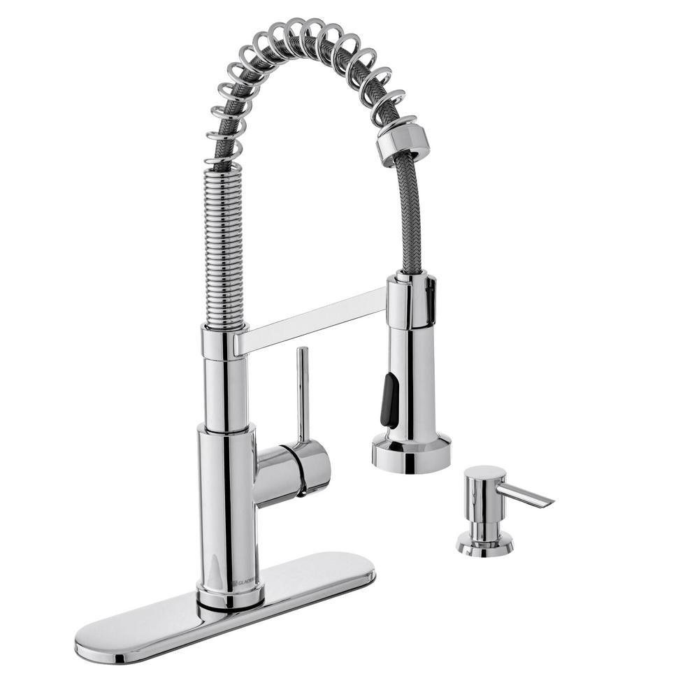 The look of a commercial style faucet with the open-coil spout adds an industrial touch and will complement your modern kitchen. The Glacier Bay Gage Coil Spring Neck Pulldown Sprayer Kitchen Faucet with TurboSpray, FastMount, and Soap Dispenser in Stainless Steel is just what you need to update your kitchen. This faucet boasts a single-handle design and a stainless steel finish. It also houses a convenient pull-down spray wand with 2-spray modes; aerated spray and TurboSpray which provides a stronger spray pattern to clean pots, pans and other dishes. A ceramic disc cartridge offers drip-free performance and a 1.8 GPM flow rate. The exclusive FastMount mounting system makes installation quick and easy. This faucet includes a soap dispenser and can fit on 1,2,3 or 4-hole sinks.
