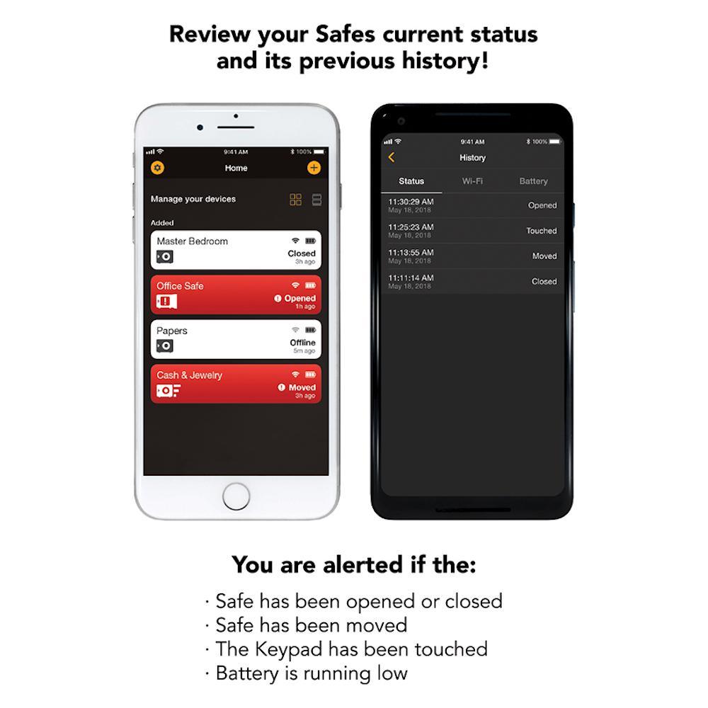 - Types of alerts received - designed to keep you up to date with any major status change for your safe, you will receive different types of alerts to your smart device, anytime one of the following conditions is met, you will be alerted: keypad is touched, safe has been opened/closed, safe has been moved, low battery, Wi-Fi status