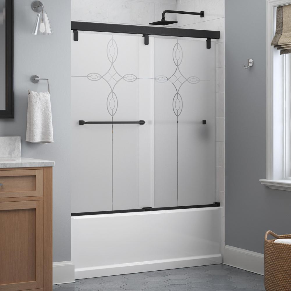 Whether you’re looking for a moderate DIY project or working on a bathroom remodel, upgrading your bathroom with a new sliding shower door is easy with the Delta 1-2-3 custom sliding shower door program. Delta’s custom glass shower door program offers 1000s of design combinations by choosing your glass shower panels, shower door track, and shower door handles to build a unique, personalized glass shower door. Clean, sleek and modern, the Mod bathtub door track in matte black features a soft close system paired with a reversible flat track, and minimal metal components, for the perfect balance of form and function. Make a statement with standard 1/4 in. ANSI certified tempered glass shower panels, featuring a modern blend of clear and frosted stripes creating a beautiful pattern that let’s in light but also offers some privacy. The Everly sliding shower door handles in matte black feature two convenient towel bars for extra bathroom storage in a transitional design silhouette that beautifully combines contemporary and classic qualities.